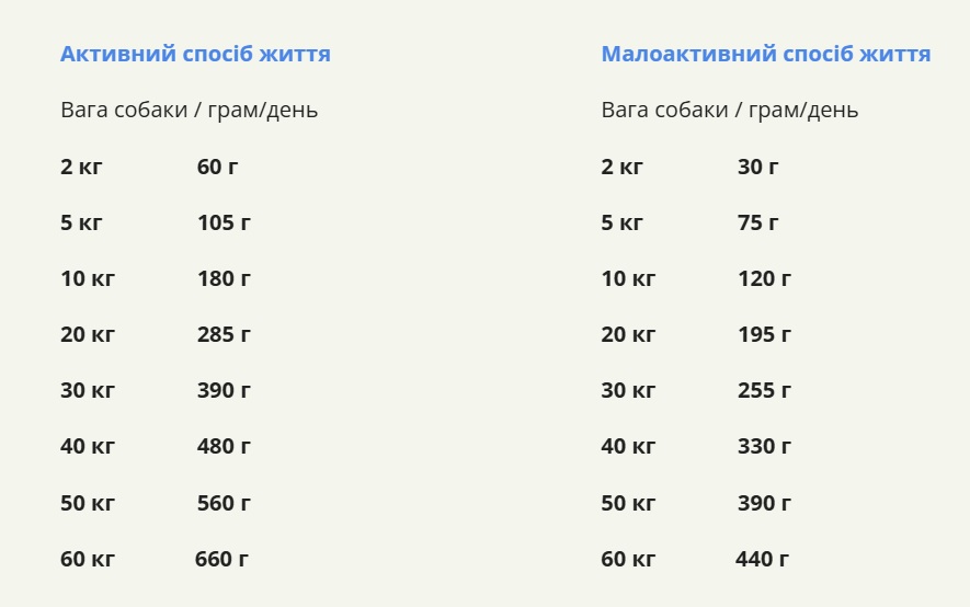 Денна норма годування для цуценят від 1,5-3 місяців становить дві добових дози дорослого собаки. Цуценятам 3-6 місячного віку добова норма корму становить 1,5 порції дорослого собаки. Цуценятам від 6-11 місяців рекомендується годувати 1,25 денної норми корму дорослої собаки. Під час вагітності денну норму корму слід збільшувати на 25% -50%. Під час лактації надайте собаці вільний доступ до корму.