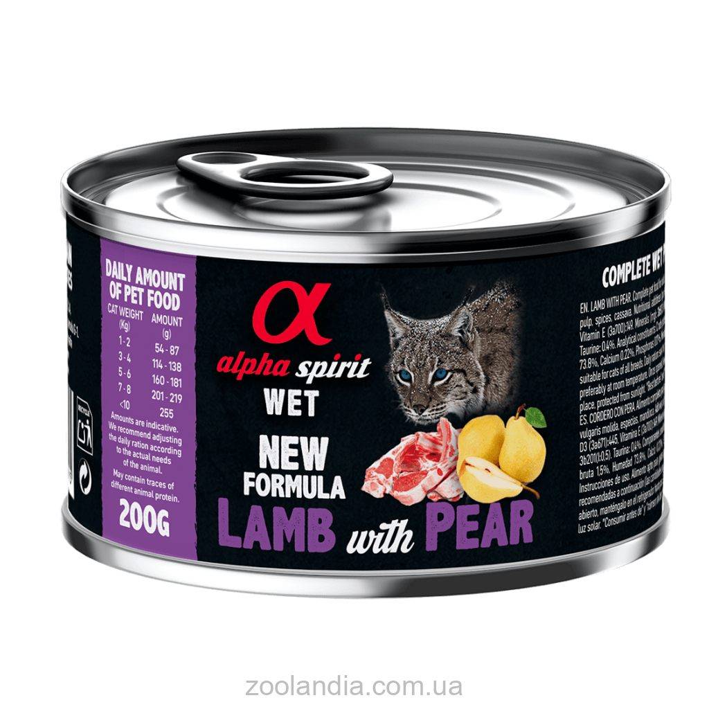 Влажный корм Alpha Spirit Lamb with Pear для взрослых кошек готовится из ингредиентов премиального качества с добавкой таурина, где единственным источником протеина - является ягнятина (93%).