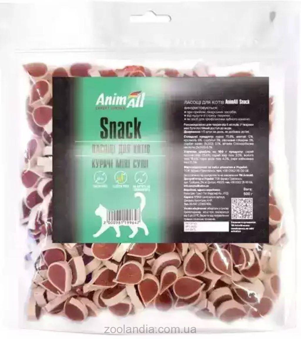AnimAll Snack куриные мини суши с рыбой - вкусное и полезное лакомство для кошек. Сухие лакомства изготавливаются методом сушки при средних температурах до минимальной остаточной влажности. Продукт проходит многоступенчатый контроль качества.