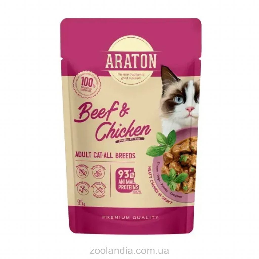 Полноценный влажный корм ARATON с говядиной и курятиной разработан для взрослых котов всех пород, для ежедневного кормления. Кусочки в соусе с таурином, витаминами и травами – для поддержания сердца, иммунной системы и ежедневной энергии любимца. Корм содержит высококачественные ингредиенты животного происхождения, обеспечивающие необходимый уровень белка для поддержания мышечной массы и активности.