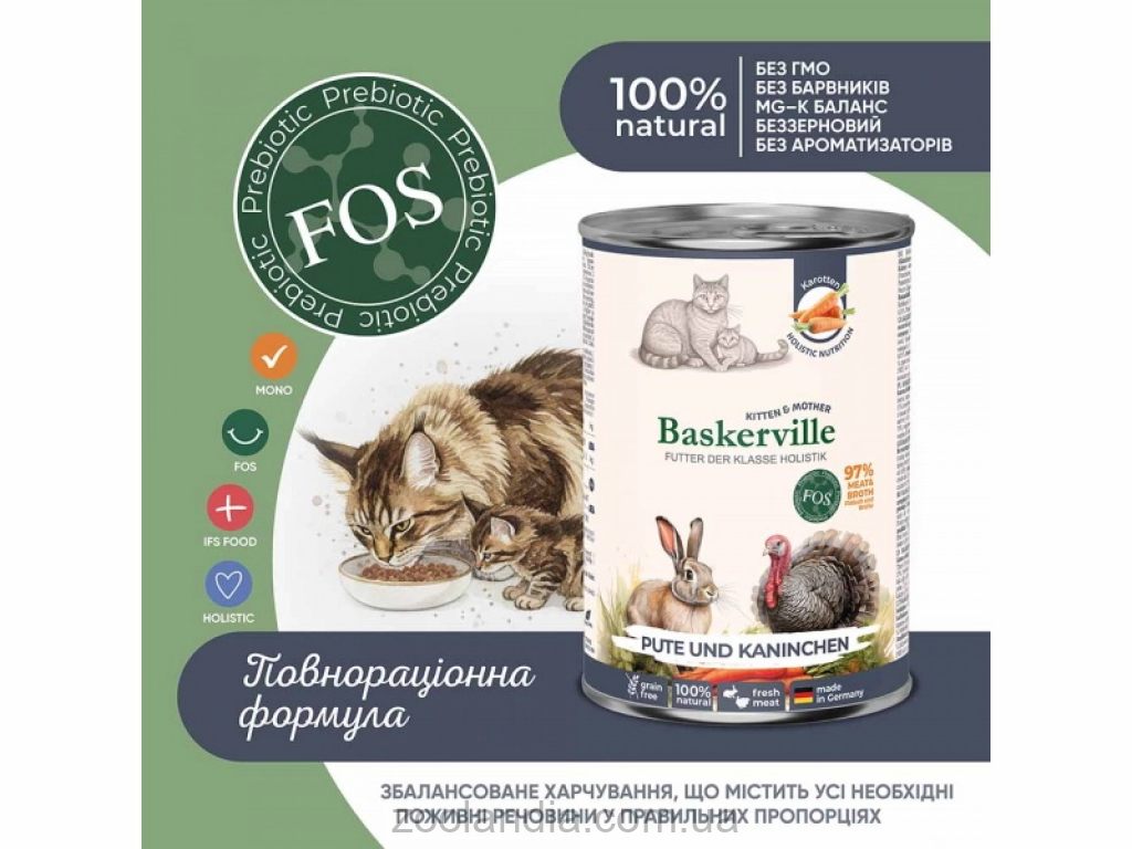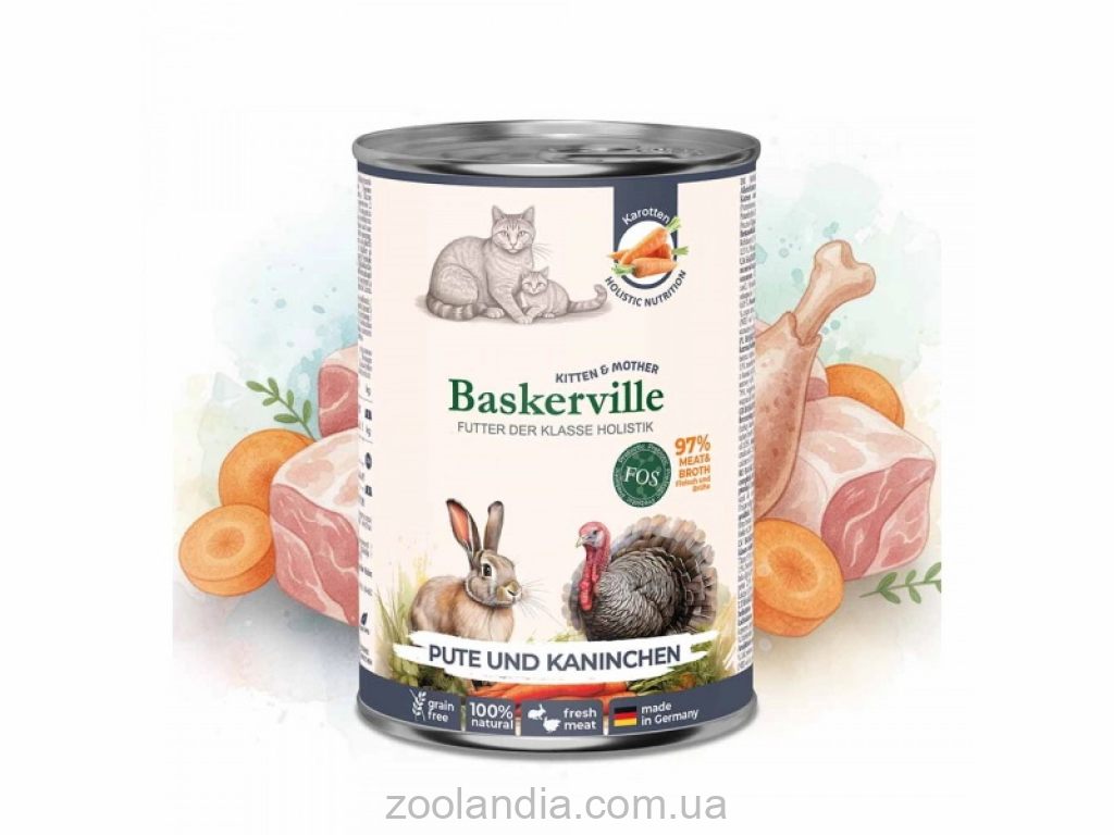 Монопротеиновый корм BASKERVILLE изготовлен европейскими специалистами специально для кошек в период лактации и котят, которым необходим повышенный уровень питательных веществ, лёгкое усвоение и поддержка иммунной системы. Его сбалансированный состав способствует здоровому росту, правильному развитию костной и мышечной ткани, а также обеспечивает достаточный уровень энергии как для активных малышей, так и для заботливых мам. Благодаря мягкой текстуре нежного мяса индейки, диетического кролика и лососевого масла корм легко поедается и обеспечивает природное питание, которое поддерживает здоровье кошки-мамы и гармоничное развитие котят в самый важный период жизни. Способствует комфортному переходу котят от молочного кормления к самостоятельному питанию.