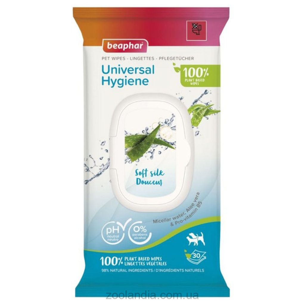 Влажные салфетки Beaphar Pet Wipes Universal Hygiene предназначены для очищения и освежения кожи и шерсти домашних животных. Изготовленные из 100% растительной вискозы, салфетки пропитаны лосьоном, содержащим 98% натуральных компонентов, которые помогают увлажнять и смягчать кожу. Средство поддерживает естественный уровень pH кожи и прошло дерматологическое тестирование.