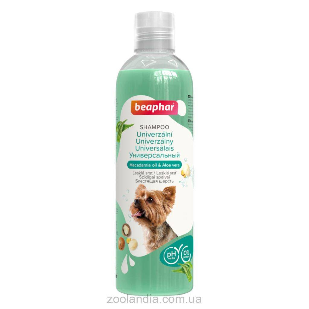 Универсальный "Макадамия и Алоэ вера" мягкий шампунь для собак имеет нейтральный рН, идеально подходит для регулярного использования для всех типов шерсти и пород собак. Средство обогащено маслом ореха Макадамия и экстрактом Алоэ вера, благодаря чему придает шерсти мягкость и блеск, делает ее свежей и чистой.