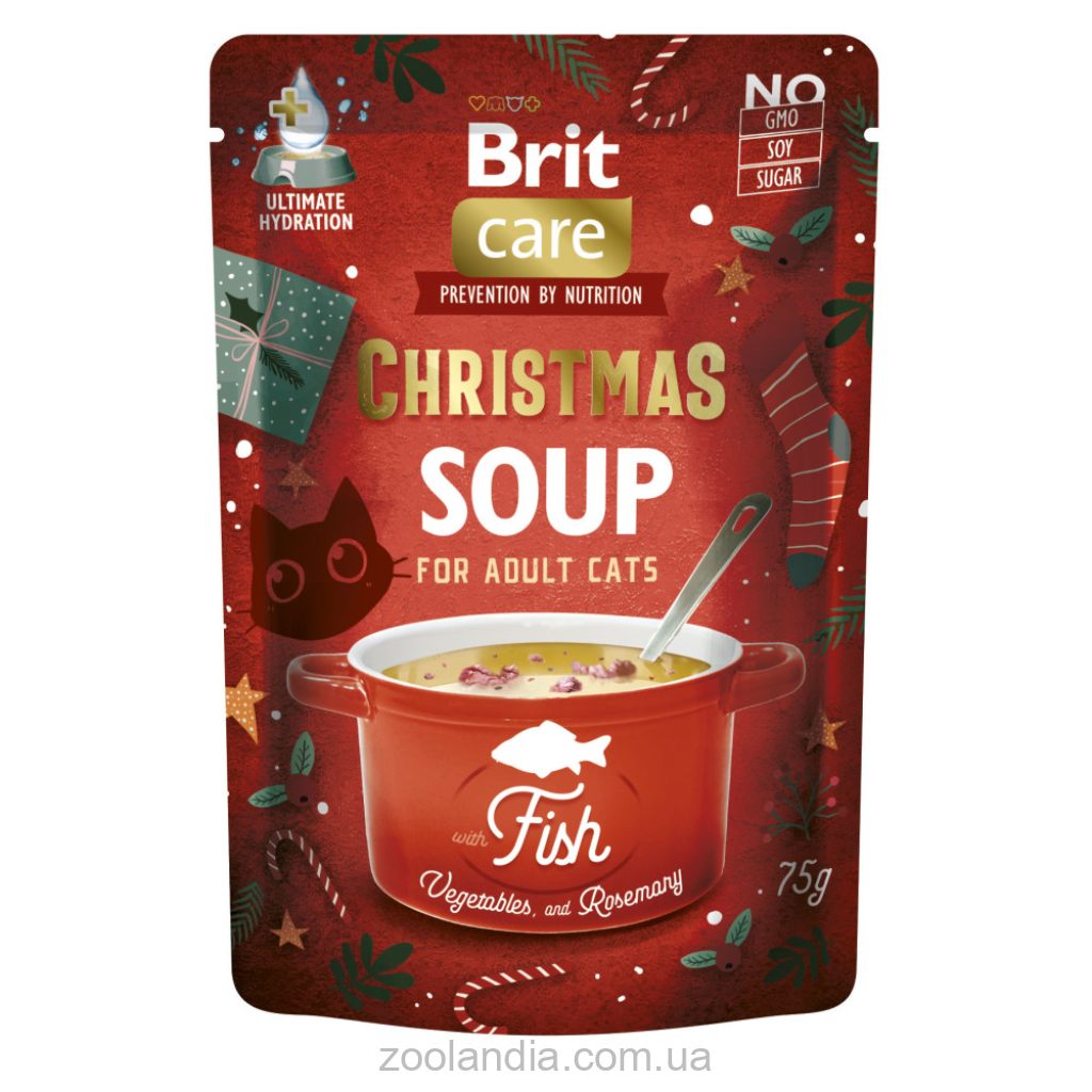 Рождество для пушистиков стало еще вкуснее! Ведь появился влажный корм для кошек Brit Care Christmas Fish Soup Рождественский суп с рыбой, овощами и розмарином.