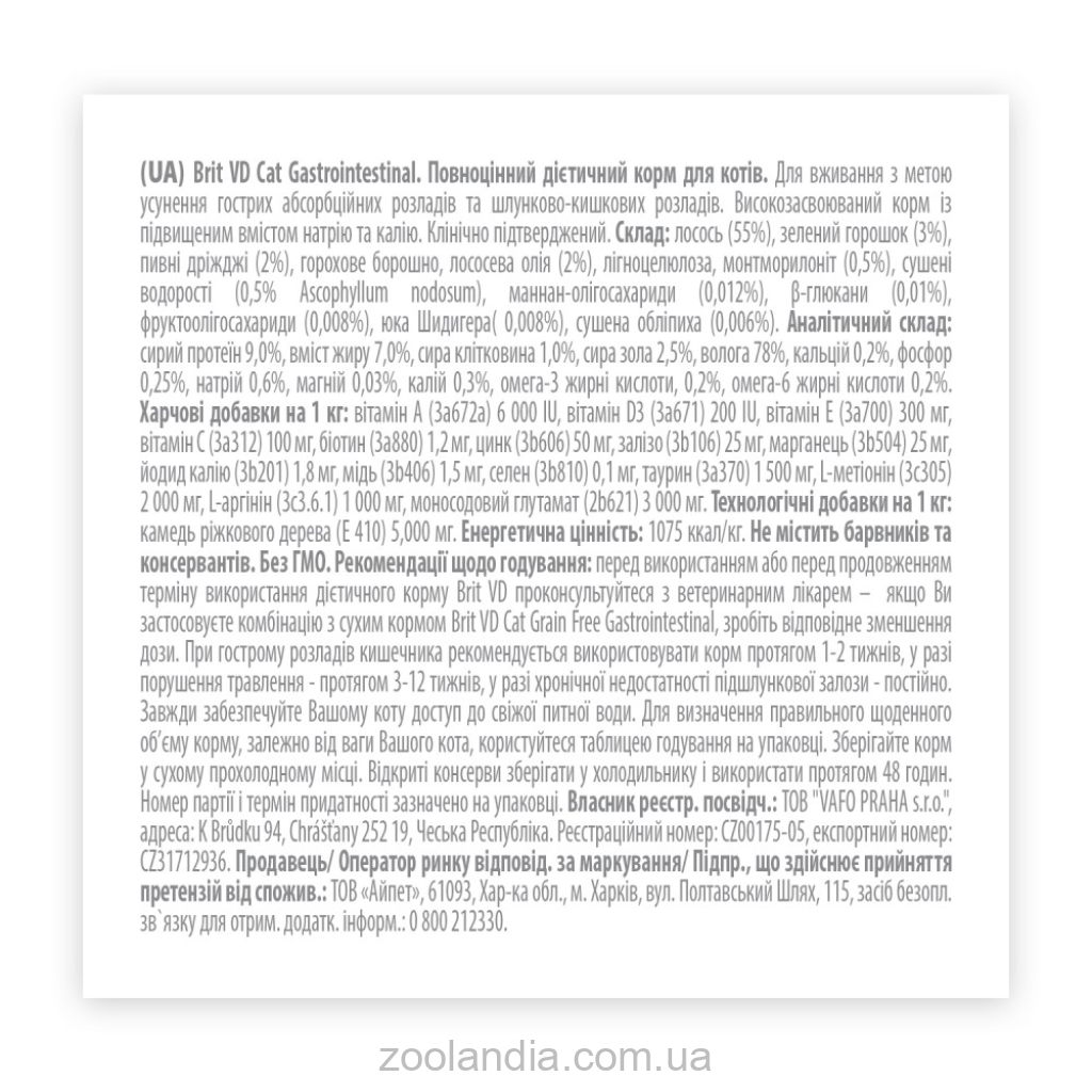 Рекомендации по кормлению: перед использованием или перед продлением срока использования диетического корма Brit VD проконсультируйтесь с ветеринарным врачом – если Вы применяете комбинацию с сухим кормом Brit VD Cat Grain Free Gastrointestinal, сделайте соответствующее уменьшение дозы. При остром расстройстве кишечника рекомендуется использовать корм в течение 1-2 недель, в случае нарушения пищеварения – в течение 3-12 недель, в случае хронической недостаточности поджелудочной железы – постоянно. Всегда обеспечивайте Вашему коту доступ к свежей питьевой воде. Для определения правильного ежедневного объема корма, в зависимости от веса кота, пользуйтесь таблицей кормления на упаковке. Храните корм в прохладном сухом месте. Открытые консервы хранить в холодильнике и использовать в течение 48 часов.