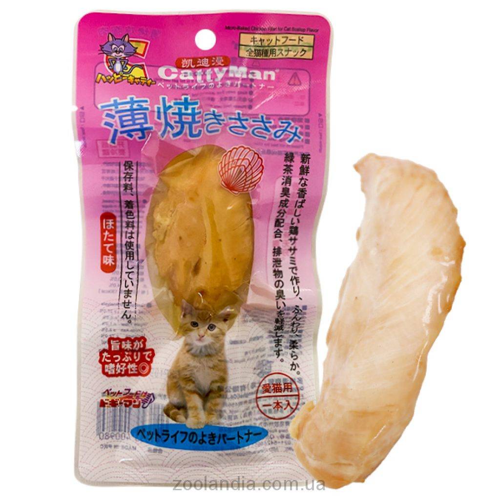Лакомство КэттиМен Chicken Fillet Scallop адаптировано для хорошего усвоения и соответствует потребностям питания взрослых котов всех пород и котят старше 2-х месяцев.