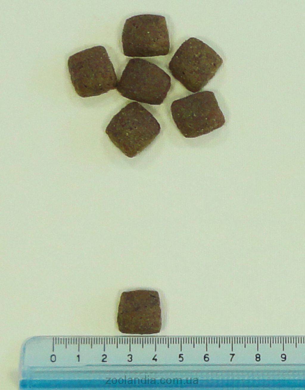 Анализ: протеин - 24%, жир – 16%, клетчатка 3,2%, зола - 6,3%, кальций - 1,1%, фосфор – 0,85%, влага – 10%, глюкозамин – 500 мг/кг, хондроитин - 500 мг/кг, обменной энергии – 15,7МДж/кг, омега 6 – 1,9%, омега 3 – 1,2%.