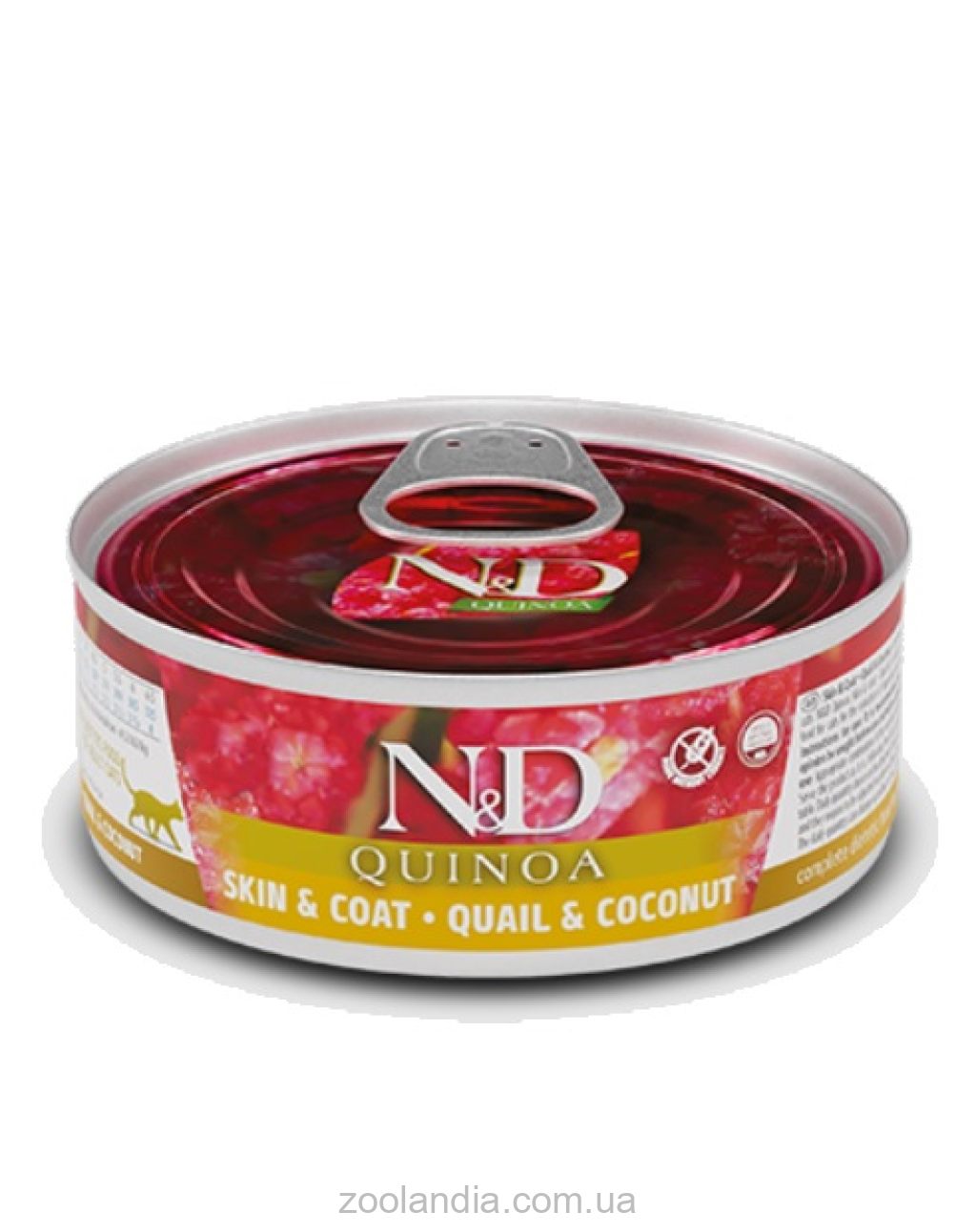 Полнорационный беззерновой влажный корм Farmina N&D Quinoa Quail Skin&Coat с перепелом, экстрактом семян киноа и кокосом для кошек с пищевой аллергией.
