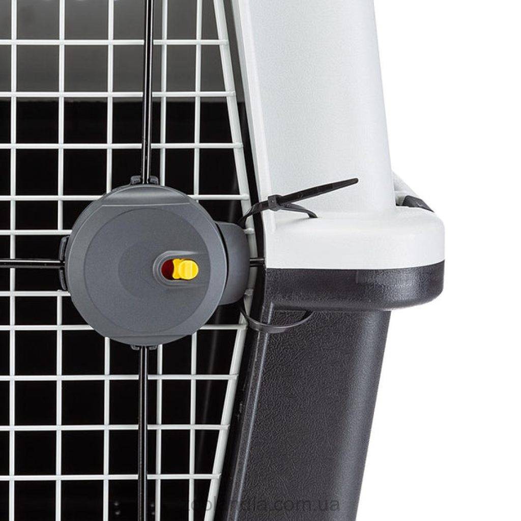 1. Металлическая дверка: Прочная дверка из металла с пластиковым покрытием и четырехточечной системой запирания гарантируют безопасность вашего питомца в пути.