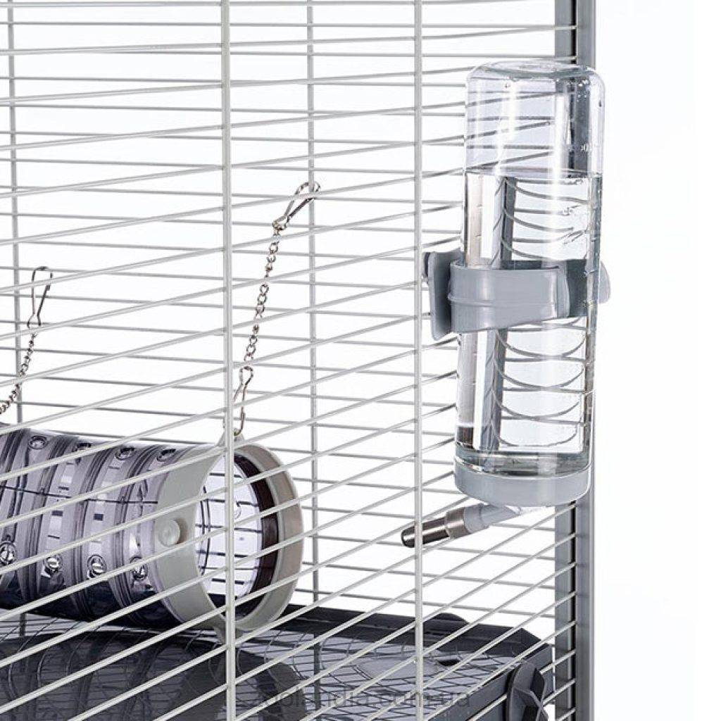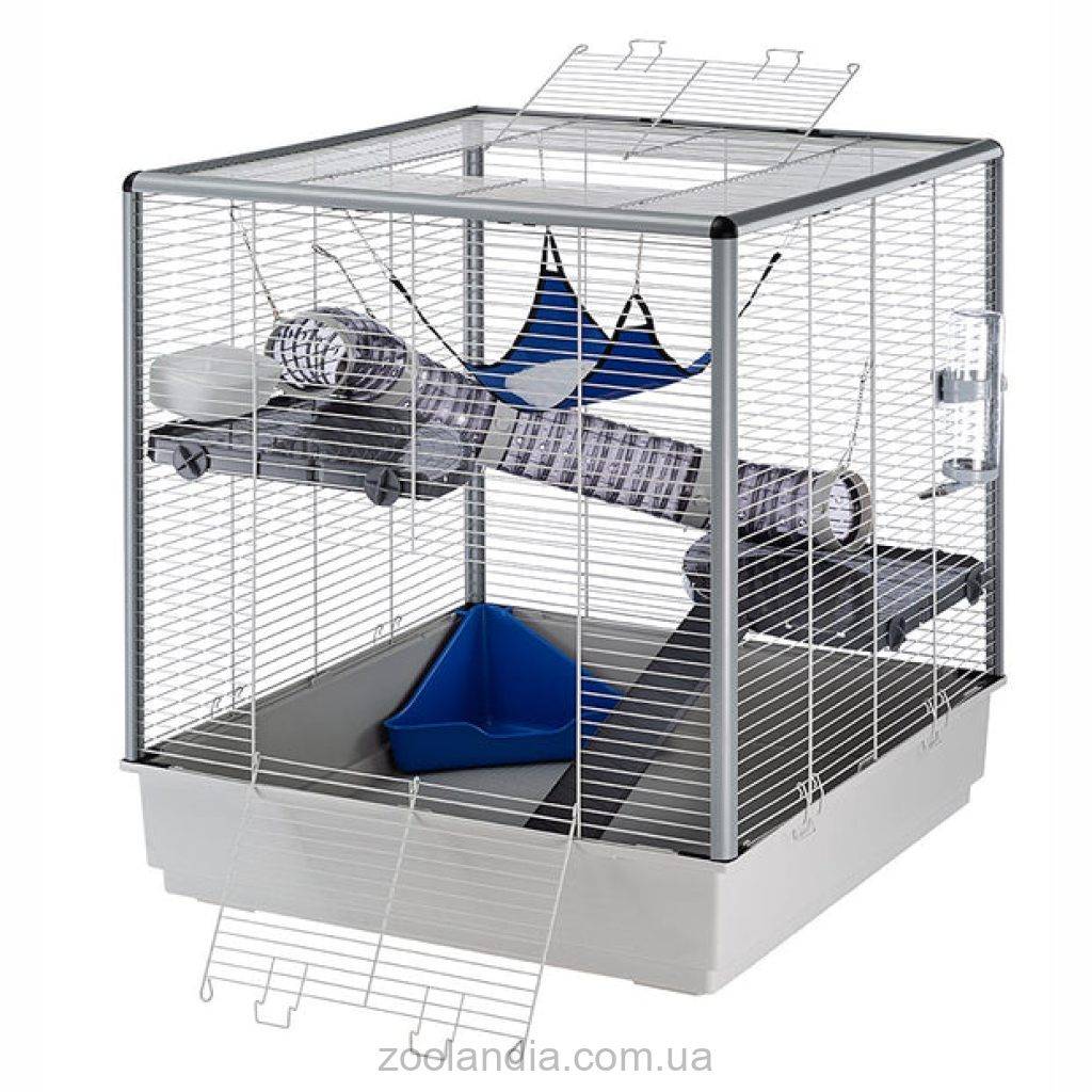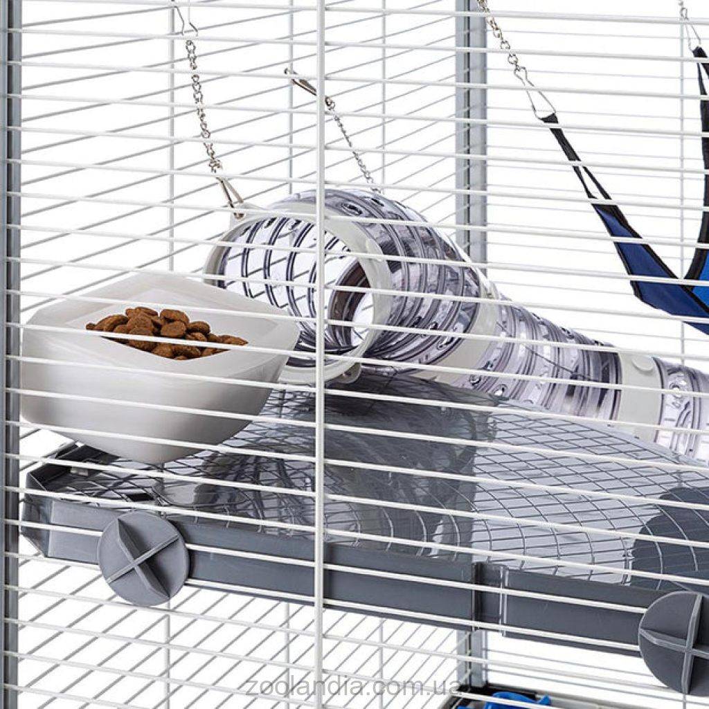 Furat Extra Large - клетка для хорьков из окрашенной стальной проволоки, а также пластиковых рамок по периметру и поддона. На крыше и спереди расположены большие открывающиеся двери, облегчающие процесс ежедневной уборки. Аксессуары в комплекте: прямоугольный туалет для хорьков, пластиковая кормушка, пластиковые полки с лесенками, гамак с цепочками для подвешивания к клетке. Также в клетке имеются подвесные пластиковые туннели для игр вашего маленького питомца. Они могут также соединять различные уровни клетки. Furat Extra Large можно чистить полностью, благодаря съемному поддону.