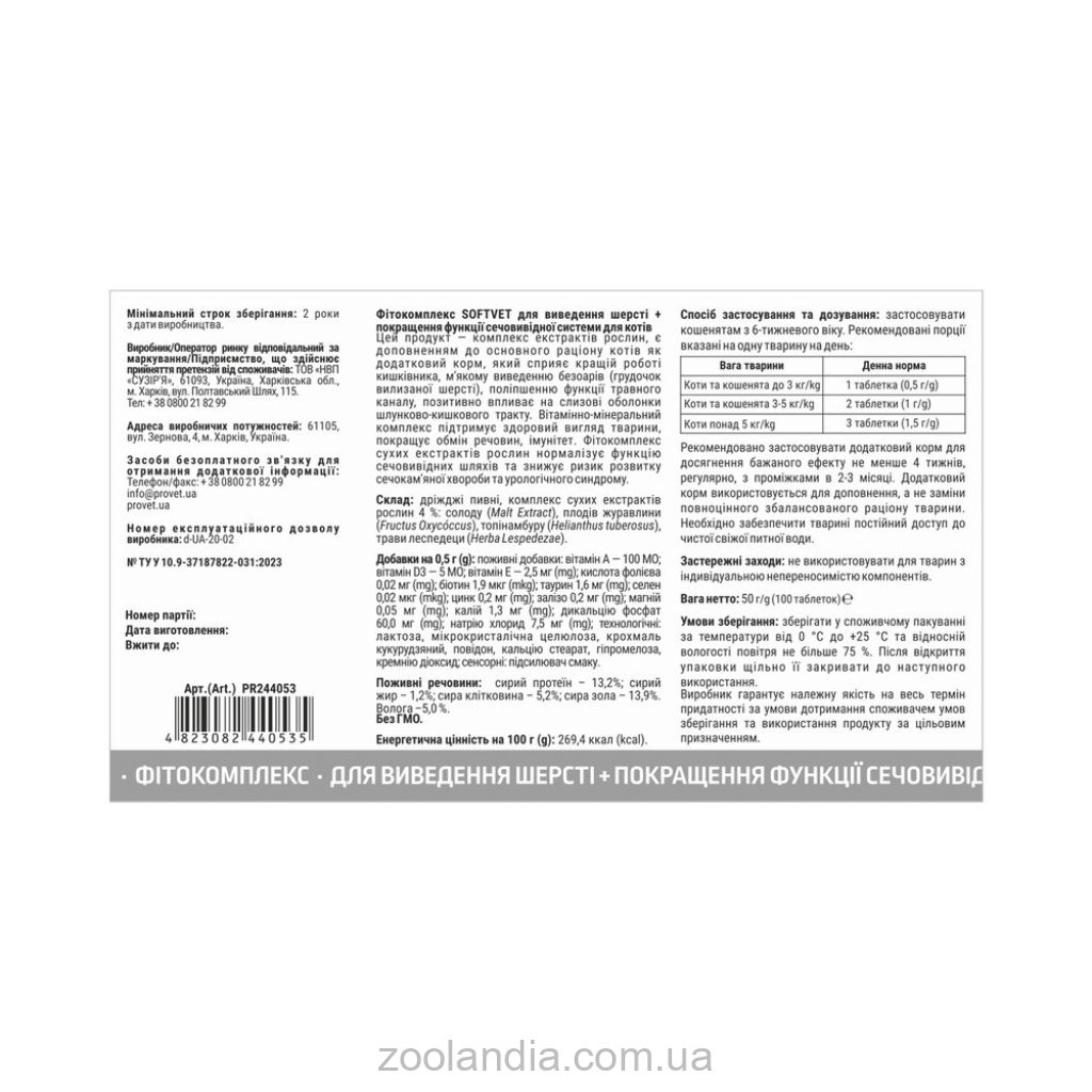 Этот продукт — фитокомплекс экстрактов растений, является дополнением к основному рациону кошек как дополнительный корм, способствующий лучшей работе кишечника, мягкому выведению безоаров (комочков вылизанной шерсти), улучшению функции пищеварительного канала, положительно влияет на слизистые желудочно-кишечного тракта.