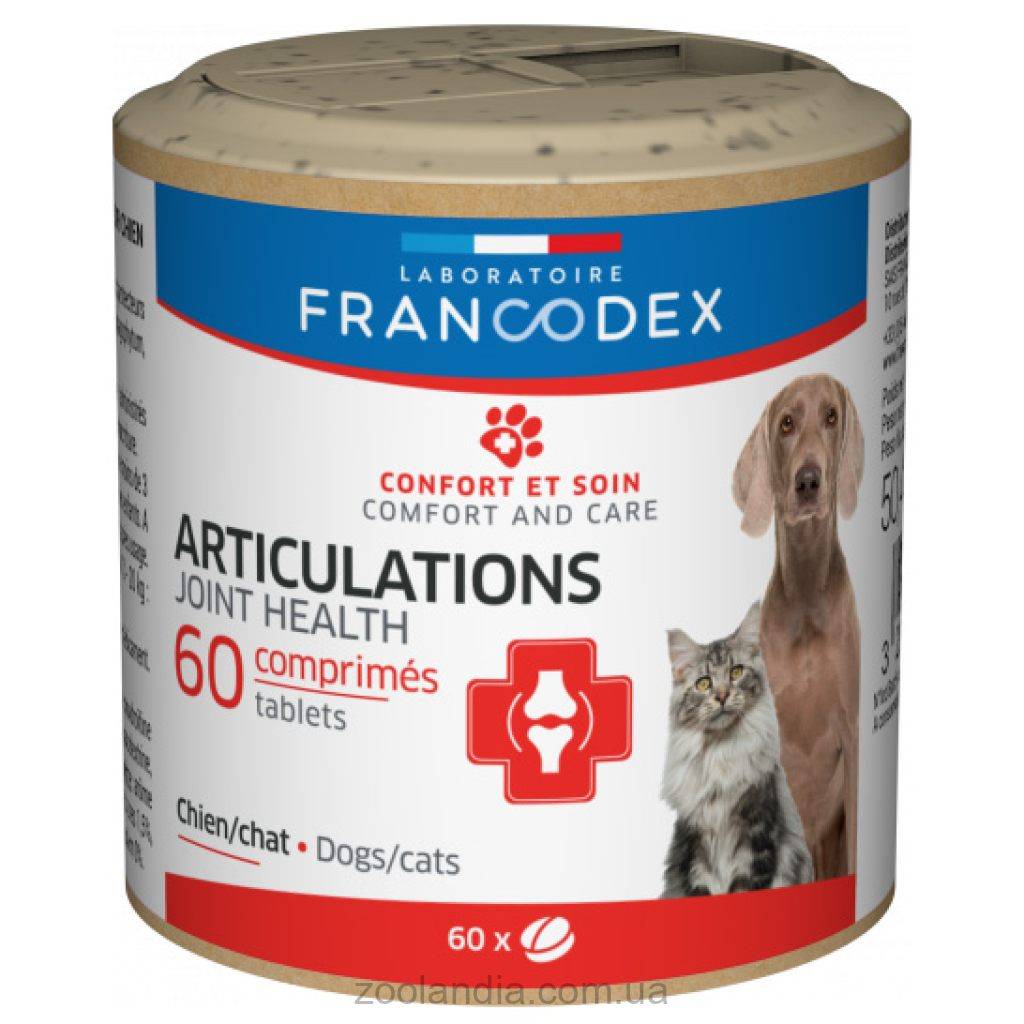 Таблетки Joint Francodex содержат хондропротекторы (глюкозамин и хондроитин), хвощ (источник кремния) и гарпагофитум, помогающие поддерживать функцию суставов и выработку хрящевой ткани.