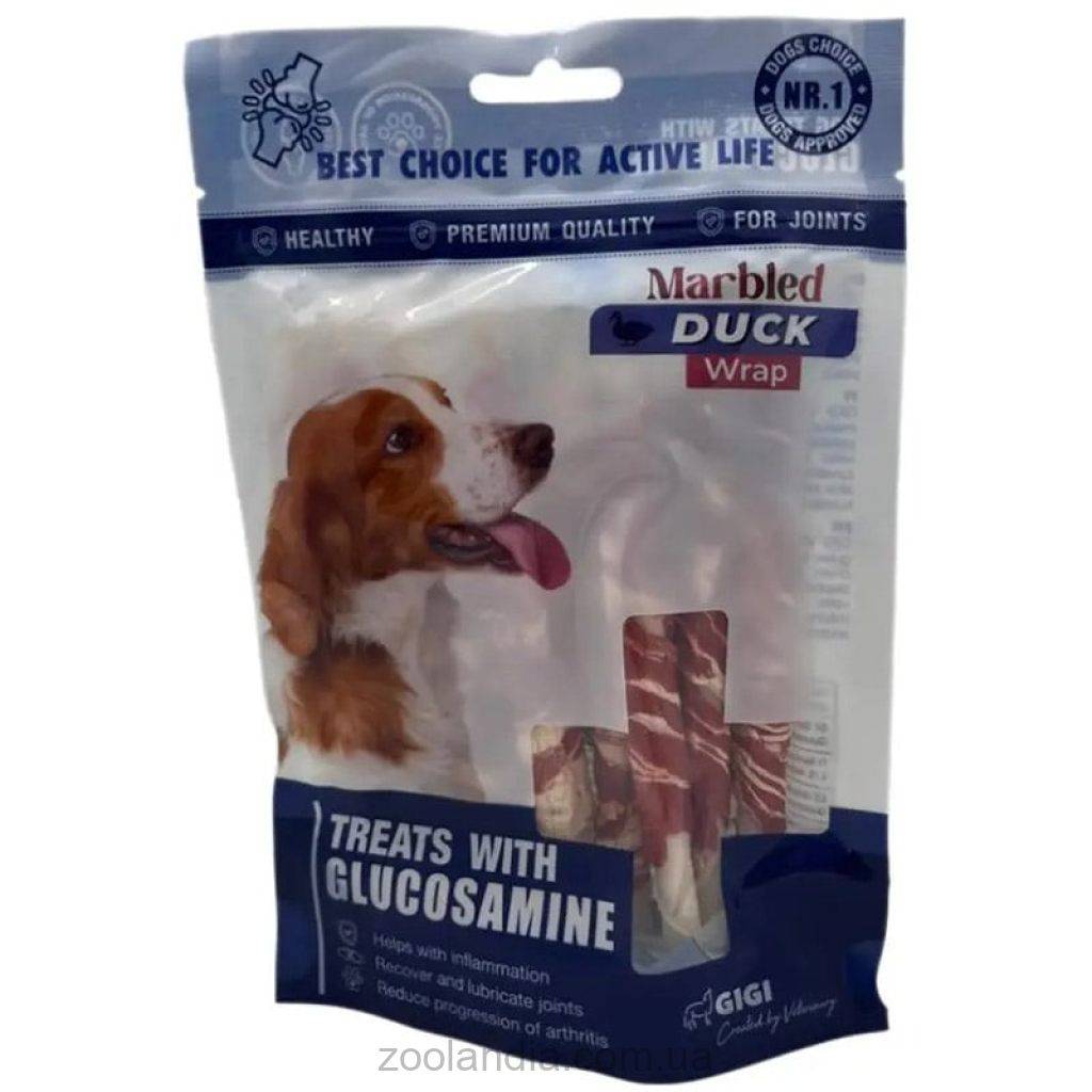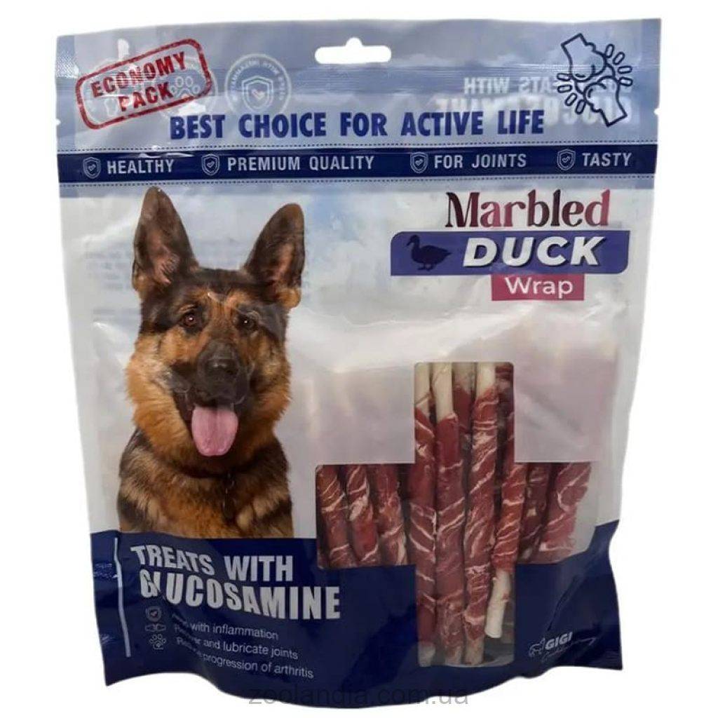 Вкусности GiGi "Палочки завернутые мясом из мраморной утки" - это вкусные и полезные палочки с уткой для Ваших любимцев, обогащенные глюкозамином. Они идеально дополняют рацион Вашей собаки и обладают такими полезными свойствами: