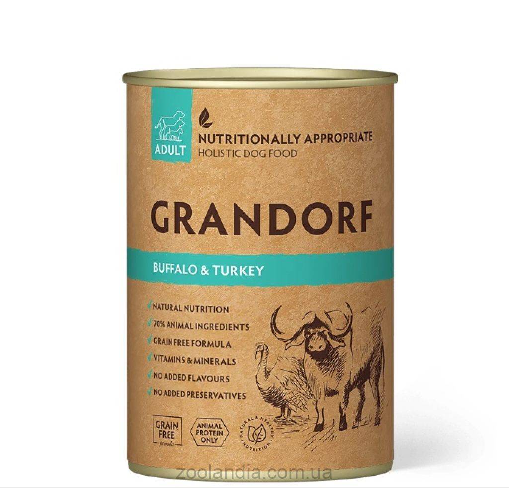 Grandorf — влажный корм для взрослых собак всех пород с нормальной активностью, чувствительным пищеварением или склонностью к аллергии.