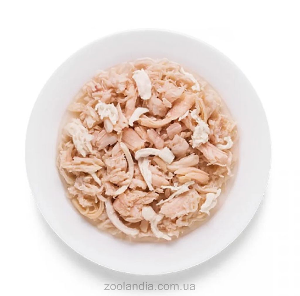 Ингредиенты: куриная грудка 65%, филе лосося 10%, собственный сок 25%. Не содержит зерновые, красители, искусственные ароматизаторы и наполнители, сою и ГМО.