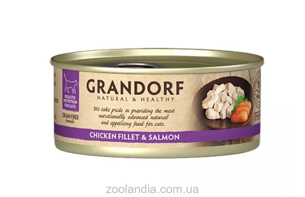 Grandorf — полностью натуральное питание для кошек из отборного мясного и рыбного филе класса Холистик, приготовленное в собственном соку. Используется только отборное парное и охлажденное, а не замороженное сырье.