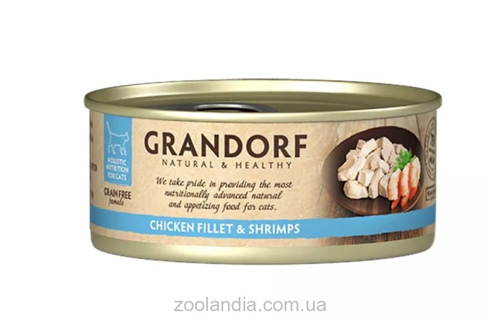 Ингредиенты: 50% куриная грудка, 25% креветки, 25% собственный сок, 0% зерновых.