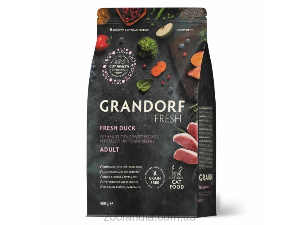 Grandorf Fresh Duck & Sweet Potato Adult - полнорационный беззерновой корм на основе свежей утки, созданный для взрослых кошек с чувствительной желудочно-кишечной системой и склонностью к пищевой непереносимости. Гипоаллергенная формула без глютена и курятины содержит только хорошо усваиваемые ингредиенты: мясо утки, батат, овощи, пребиотики и живые пробиотики — для поддержания здоровой микрофлоры и комфортного пищеварения. Сбалансированный рацион помогает сохранять жизненную энергию и здоровье кожи и шерсти на высоком уровне.