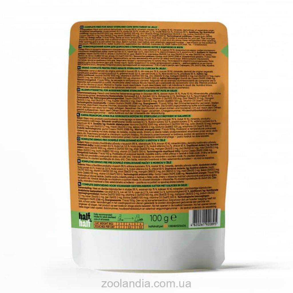 Облегченный по калорийности влажный рацион Half&Half станет отличным диетическим дополнением к сухому корму для стерилизованных малоактивных кошек, в том числе пожилых любимцев.