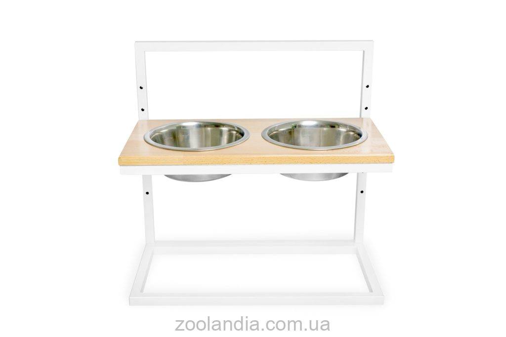 Medium (42x21cm / Миски 0,75 л / Диаметр миски 15 см). Возможная высота 10cm/15сm/20cm. Шаг регулировки высоты 5 см. Подходит для маленьких и средних собак.