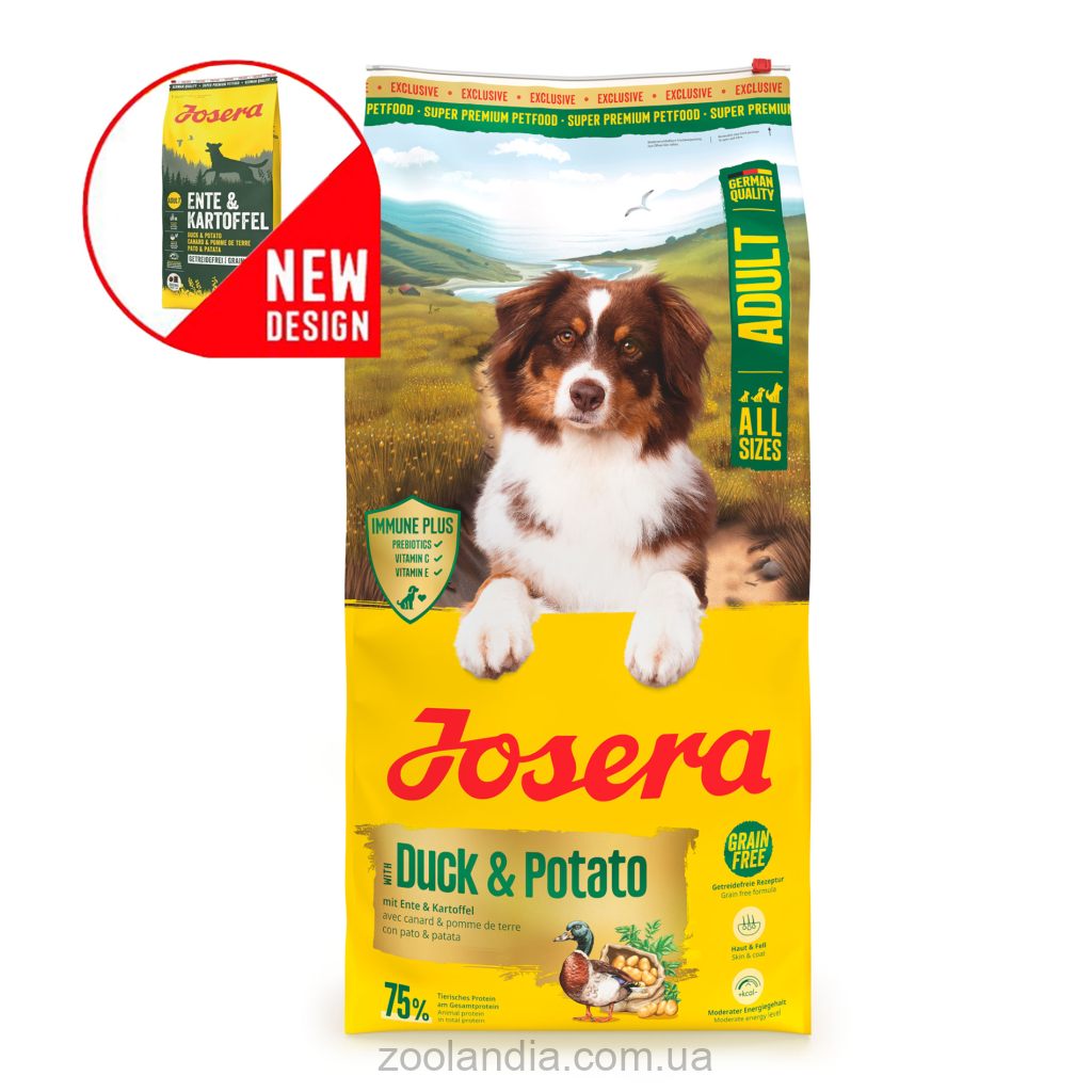Josera Ente & Kartoffel - полнорационный сбалансированный корм супер премиум класса для взрослых собак всех пород. Корм не содержит зерновые культуры, что делает его идеальным продуктом для животных с пищевой аллергией на злаки или с чувствительным пищеварением. Единственный источник белка в корме — полезное мясо утки. Незаменимые жирные кислоты, биотин, витамины, цинк и медь обеспечивают здоровье кожи и блеск шерсти.