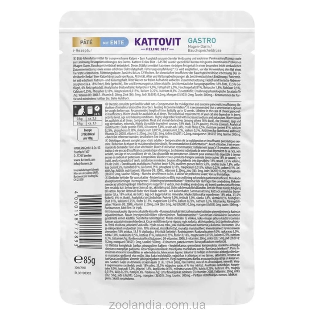 Лечебный корм для котов Kattovit Veterinary Gastro паштет с уткой рекомендуется использовать по назначению и под контролем ветеринарного врача.