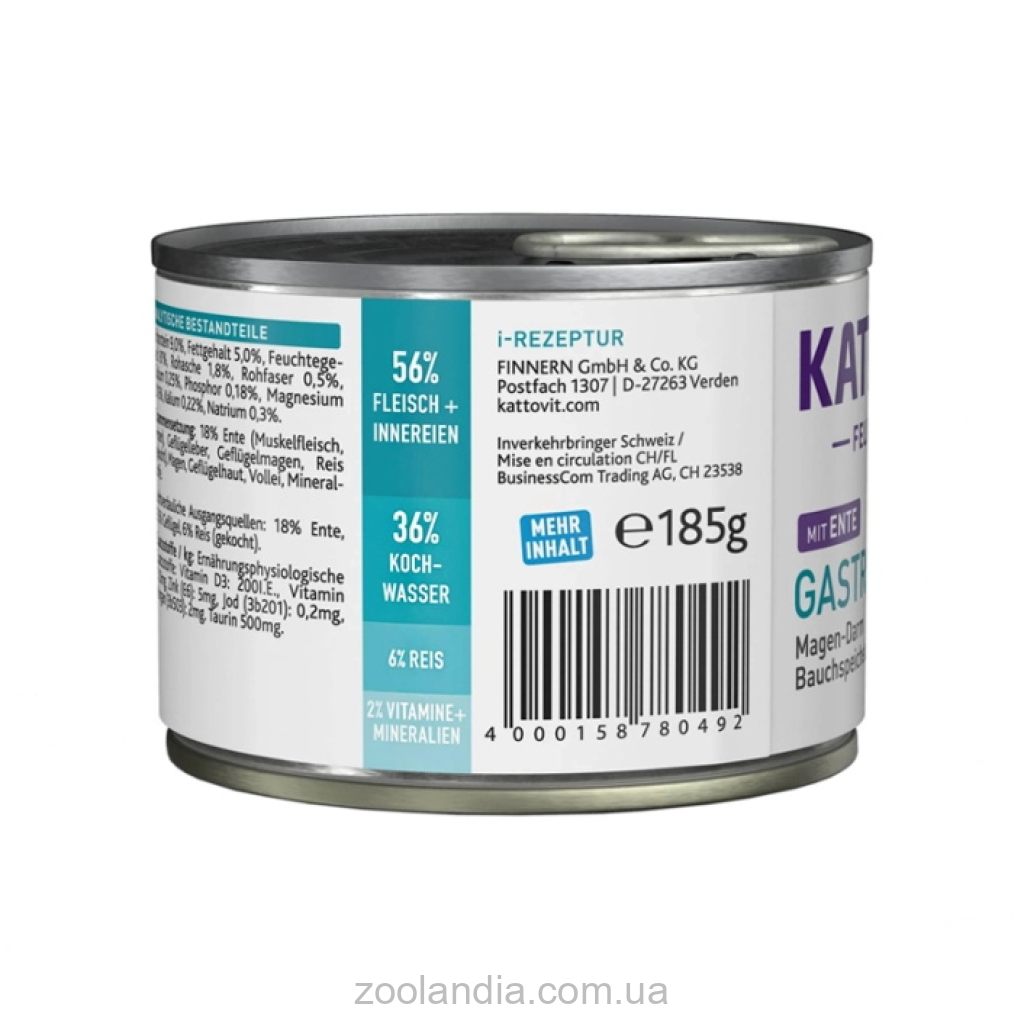 Консервы Kattovit Veterinary Gastro с уткой созданы на основе I-формулы (от англ. Intestinal) и отличаются тщательно подобранным составом, который легко усваивается и не раздражает пищеварительный тракт. В рецептуре используются ингредиенты, хорошо воспринимаемые даже ослабленным организмом: нежирное мясо утки, субпродукты птицы, вареный рис и цельное яйцо. Отсутствие глютена делает корм безопасным для котов с чувствительным пищеварением и снижает риск развития аллергических реакций.
