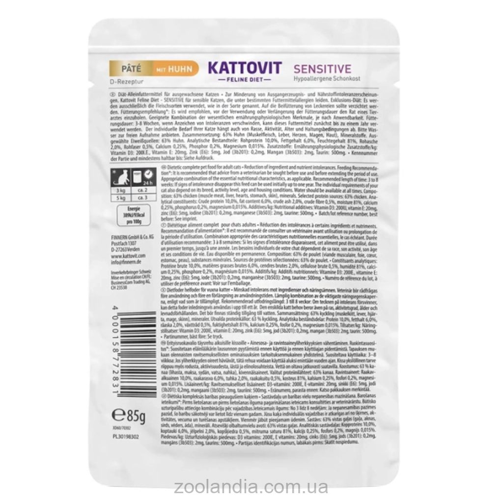 Корм Kattovit Veterinary Сенситив разработан по так называемой D-формуле – это ветеринарный подход к питанию для чувствительных животных. Такая диета направлена на снижение начальных симптомов пищевой непереносимости, включая зуд, кожные высыпания, проблемы с ушами, а также частую рвоту, понос или вздутие живота. Kattovit Veterinary Sensitive помогает организму восстановиться, успокаивает пищеварение и подходит для длительного применения. Можно кормить только им – это полноценный рацион с витаминами и микроэлементами.