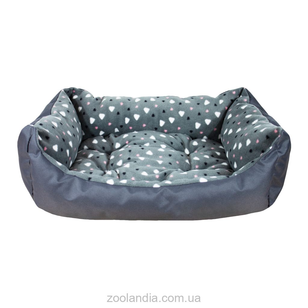 • привабливий принт і дуо-рішення – зима+літо. Дві тканини – Фліс та Оксфорд, як день і ніч – різні, проте в синтезі розв’язують проблеми зони відпочинку упродовж всього року. Флісова поверхня з серцями на графітовому тлі - м’яка, ніжна, тепленька. Вона огортає домашнє диво з хвостиком, оберігає від протягів та низьких температур і на контрасті – Оксфорд - міцний, з ефектом «антикіготь» та водовідштовхувальними показниками, з щільним плетінням полотна та стійкий до щоденної, активної експлуатації – він врятує від літньої спеки та збереже комфортну температуру тіла;