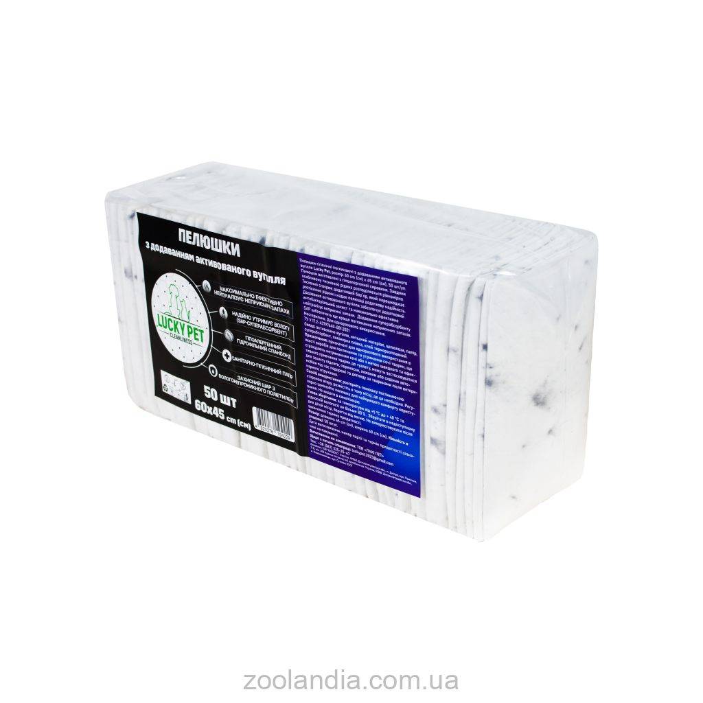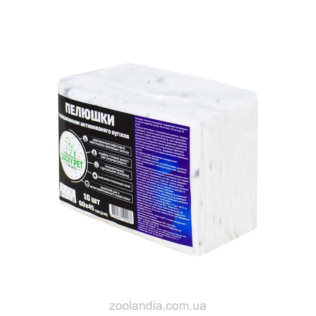 Пеленки гигиенические поглощающие с добавлением активированного угля Lucky Pet Пеленки изготовлены из гипоаллергенного сырья. Благодаря особому тиснению жидкость распределяется равномерно. Тиснение создает дополнительный барьер, препятствующий растеканию жидкости и придающий пеленке дополнительную надежность. Добавление активированного угля обеспечивает дополнительную антибактериальную защиту и максимально эффективно нейтрализует неприятные запахи. Добавление суперабсорбента SAP обеспечит еще лучшее поглощение неприятных запахов.