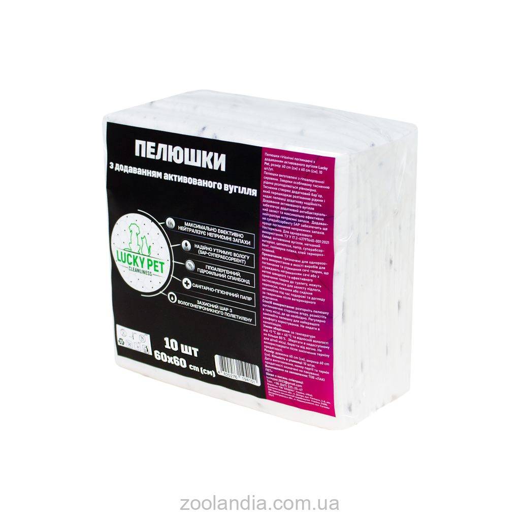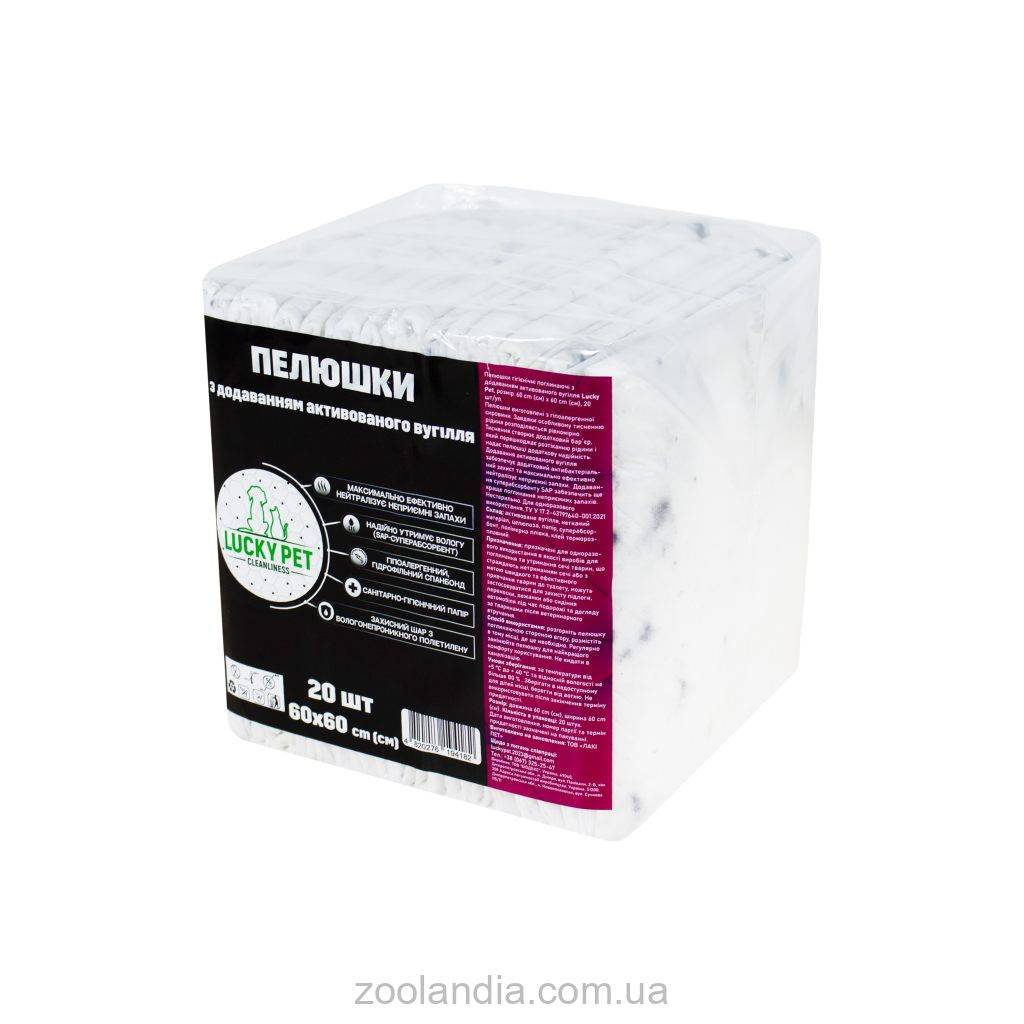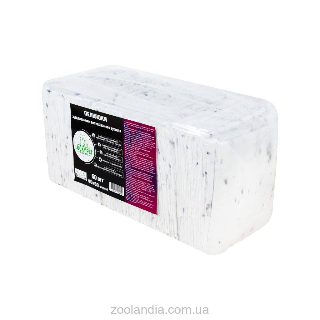 Пеленки гигиенические поглощающие с добавлением активированного угля Lucky Pet Пеленки изготовлены из гипоаллергенного сырья. Благодаря особому тиснению жидкость распределяется равномерно. Тиснение создает дополнительный барьер, препятствующий растеканию жидкости и придающий пеленке дополнительную надежность. Добавление активированного угля обеспечивает дополнительную антибактериальную защиту и максимально эффективно нейтрализует неприятные запахи. Добавление суперабсорбента SAP обеспечит еще лучшее поглощение неприятных запахов.