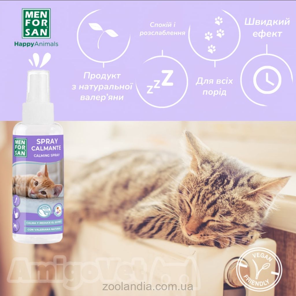 Успокаивающий антистресс спрей для кошек с валерианой. Естественное решение для контроля и уменьшения тревоги и стресса помогает контролировать нежелательные поведенческие проблемы у кошек. ВАЛЕРИАНА приносит бодрость и благополучие. Он легко распиливается в окружающую среду и оказывает моментальный эффект. Предотвращает плохое поведение, такое как чрезмерное царапание в нежелательных местах или постоянное мяуканье, метки мочой. Очень действенный для визитов к ветеринару или переезду в незнакомое окружение, нового члена в доме или других стрессовых ситуаций.Обеспечивается психическая стабильность кошек в необычных ситуациях, такие как грозы, громкие звуки, поездки, авиаперелеты и т.д. Рекомендуется использовать в сочетании с ошейником и успокаивающими пипетками для кошек.