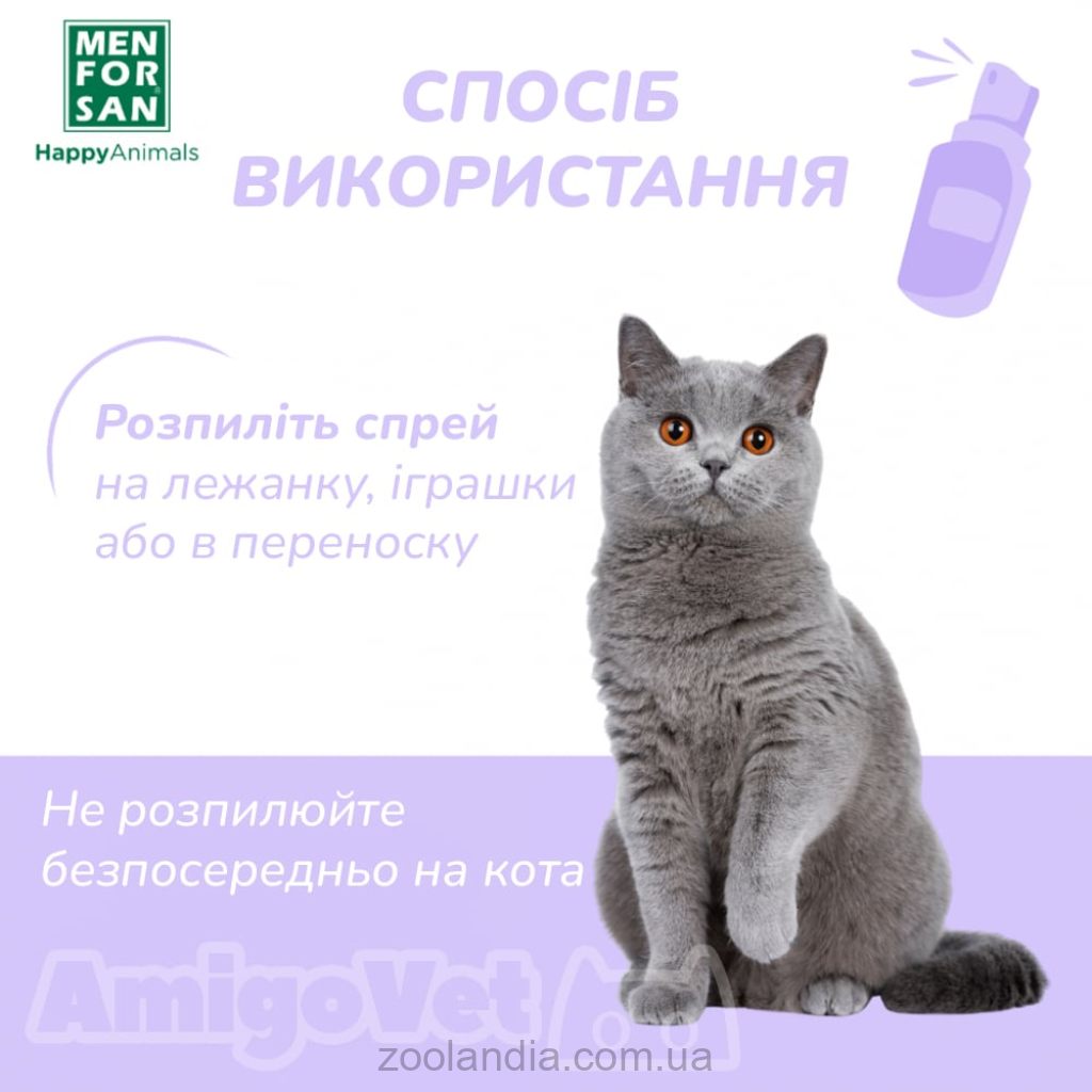 Способ использования:Перед использованием хорошо взболтать.Распылите на одеяла, игрушки, дряпалки, переноску или другие предметы, окружающие животное или место где будет путешествовать животное.Не распыляйте прямо на кота.