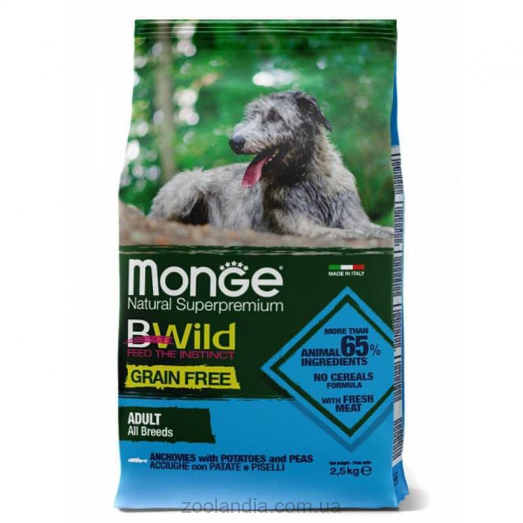 Полноценный сбалансированный корм с анчоусом BWild Grain Free Anchovies Adult All Breeds от европейского бренда Monge является полноценным ежедневным питанием.