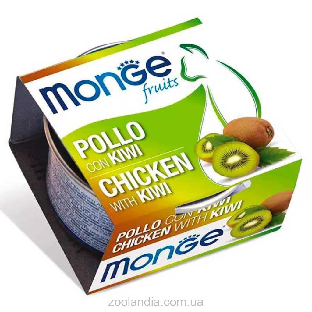 Состав: курица 55%, киви 5%, рис, F.O.S (фруктоолигосахариды) 400 мг/кг. Сырой протеин: 13,0%, сырой жир: 0,5%, сырая клетчатка: 1,0%, сырая зола: 2,0%, влажность: 82,0%.