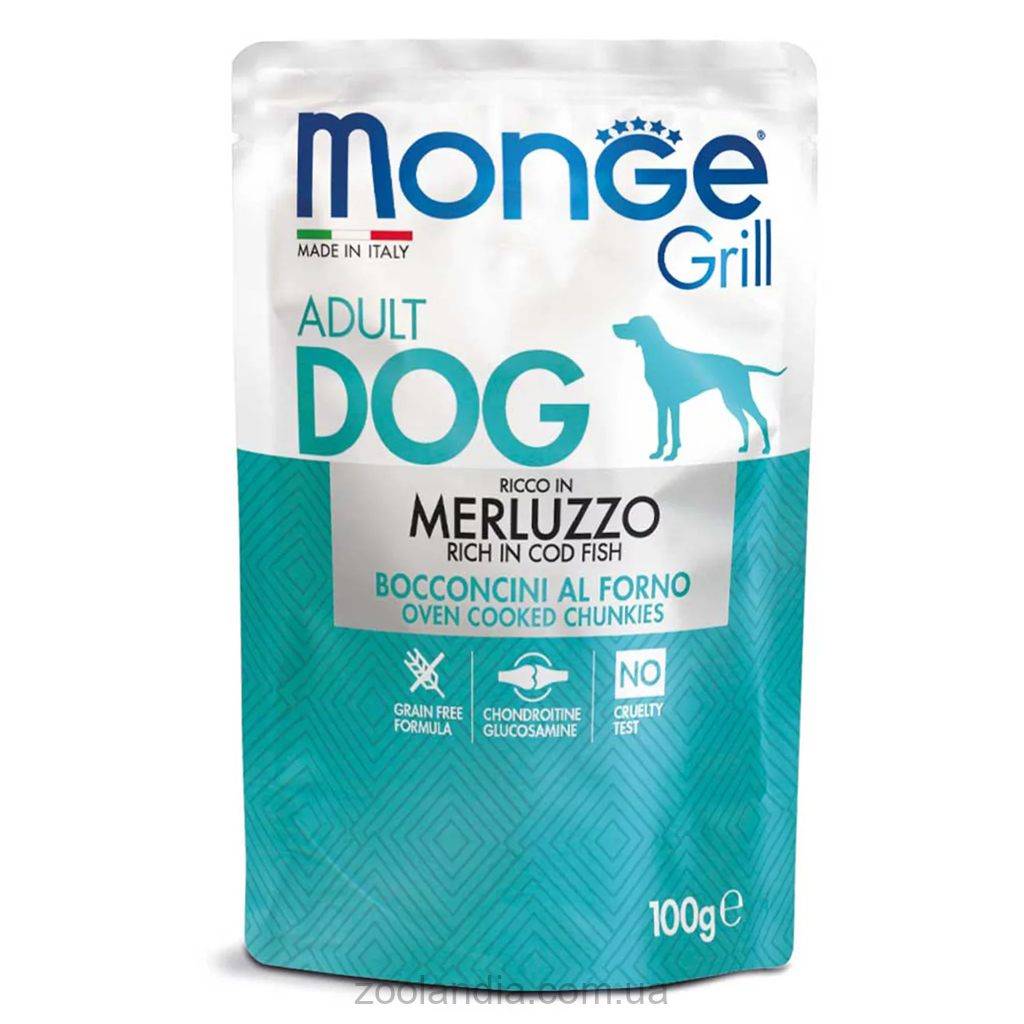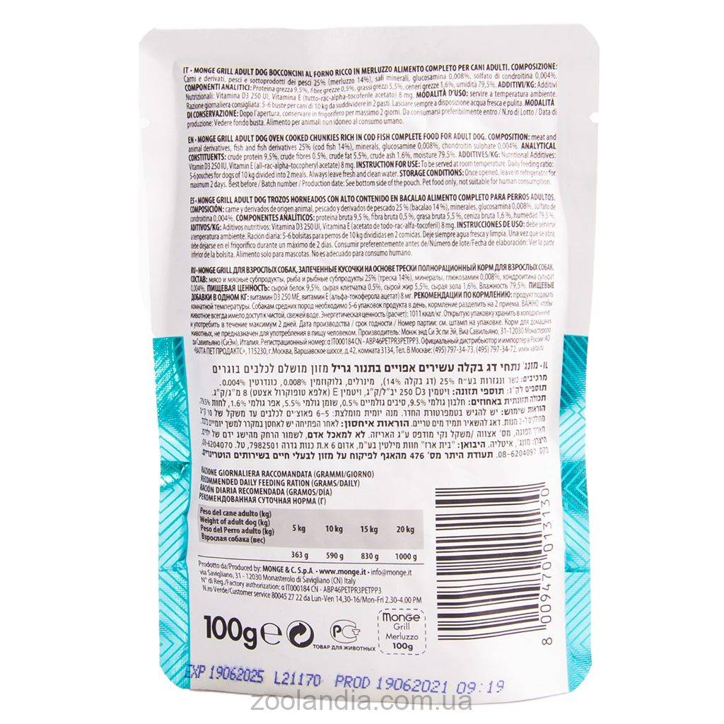 Консервы для собак Monge Grill Cod Fish - это итальянский беззерновой влажный корм для взрослых собак, созданный на основе запеченного мяса трески. Подходит для собак всех пород и доступен в форме паучей.