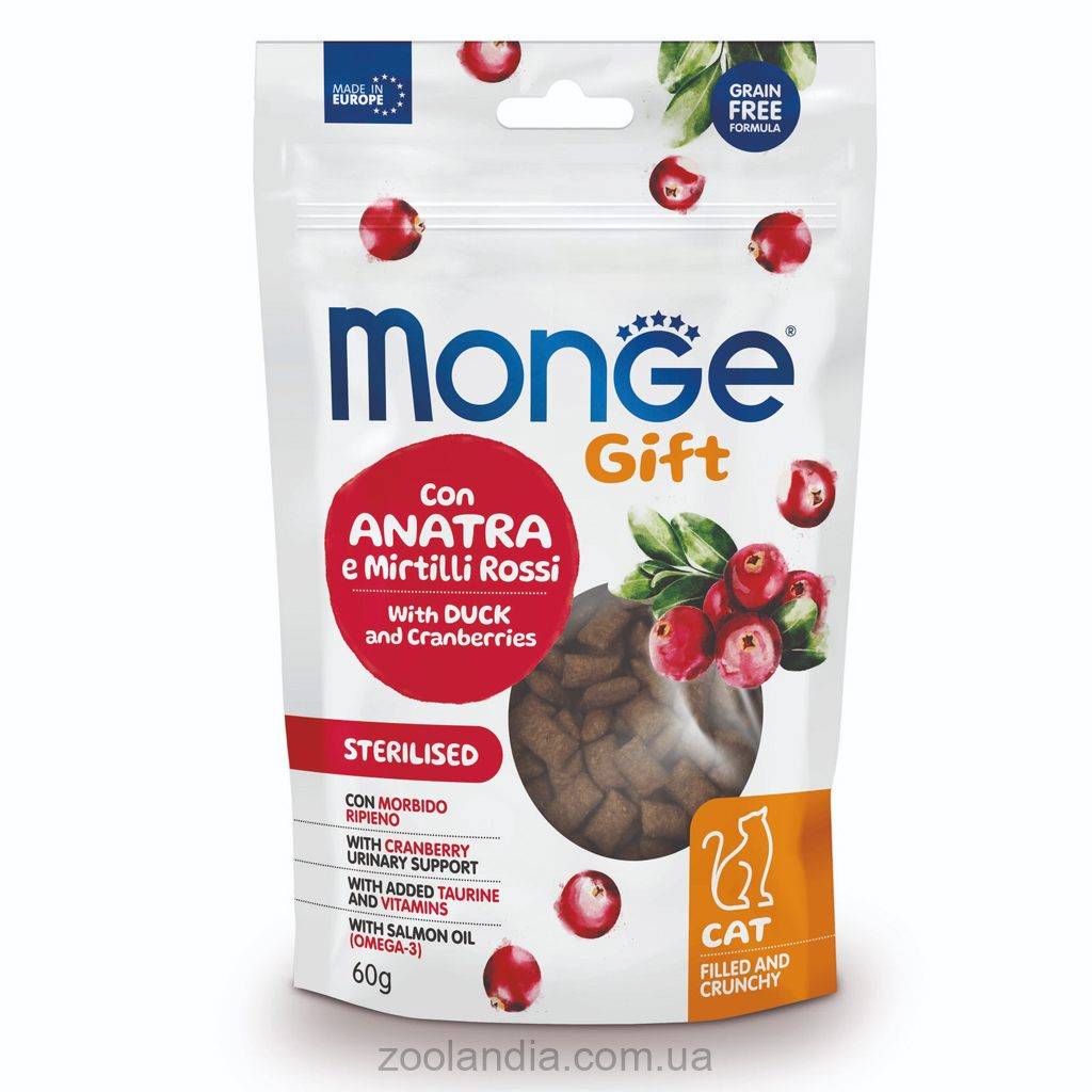 Лакомство для кошек Monge Gift Cat Sterilised Duck & Cranberries Filled and Crunchy - это хрустящие гранулы с мягким наполнением, разработанные как дополнение к основному рациону для взрослых животных. Они специально созданы для того, чтобы ваша кошка чувствовала себя комфортно и счастливо благодаря внешнему хрустящему слою, способствующему гигиене зубов, и мягкой начинке из клюквы, которая поддерживает здоровье мочевыводящих путей.