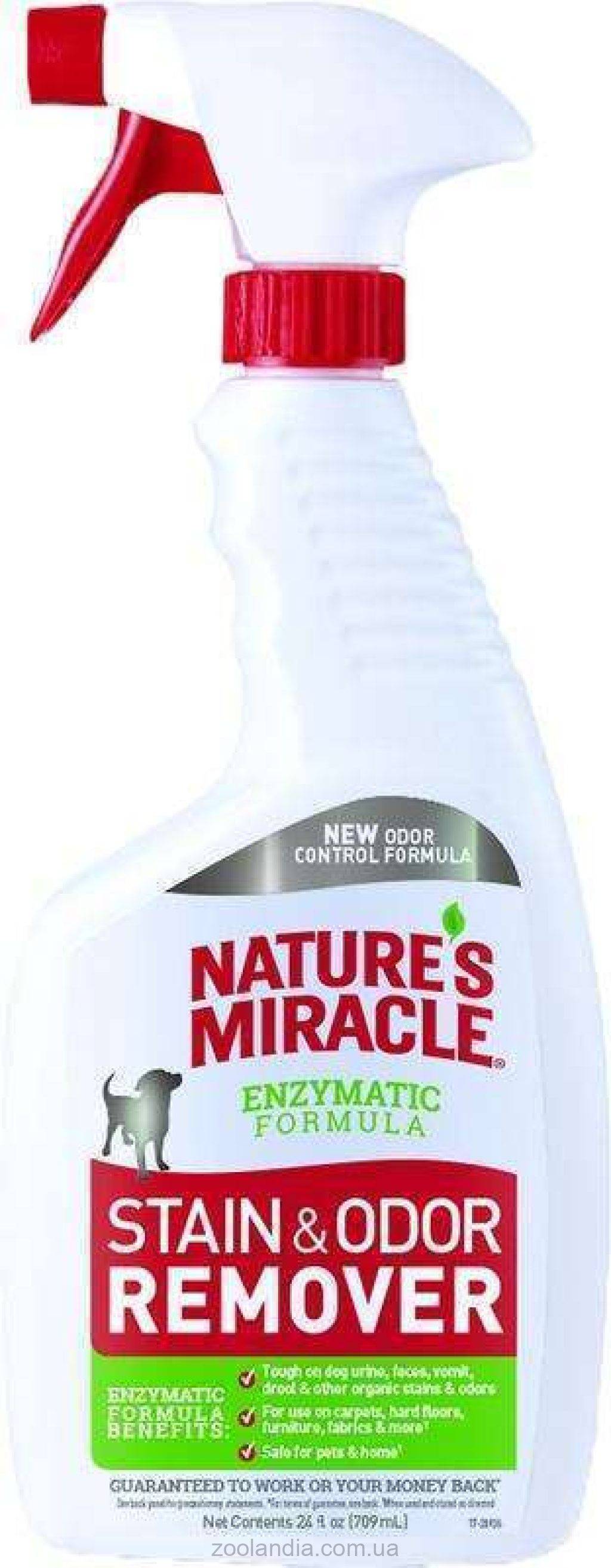 Nature's Miracle (Нейчерс Миракл) Stain&Odor Remover Уничтожитель пятен и запахов от собак - универсальное средство, которое позволяет удалять пятна, оставляемые собаками и нейтрализовать неприятные запахи. Для этого средства не составит труда удалить пятна и запахи от мочи, фекалий, рвотных масс, травы, грязи, крови. Может применяться для очистки мебели и ковров, подстилок и одежды, полов и лотков и др.поверхностей. Активная формула быстро уничтожает пятна и полностью нейтрализует неприятный запах, а не маскирует его. Удаляет не только свежие загрязнения, но и даже очень въевшиеся пятна. Препарат начинает работать сразу после нанесения, глубоко проникая внутрь загрязнения. Био-энзимная формула очень быстро вступает в реакцию с органическими загрязнениями и удаляет их, полностью нейтрализует запах органический загрязнений. Препарат не требует смывания с поверхностей и рекомендуется естественное высыхание обработанных поверхностей
