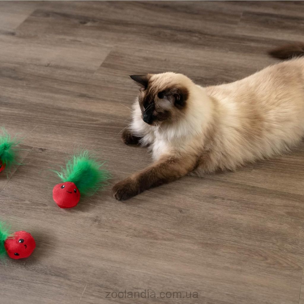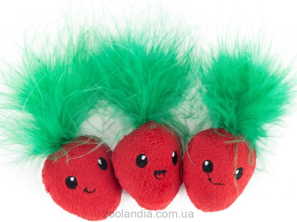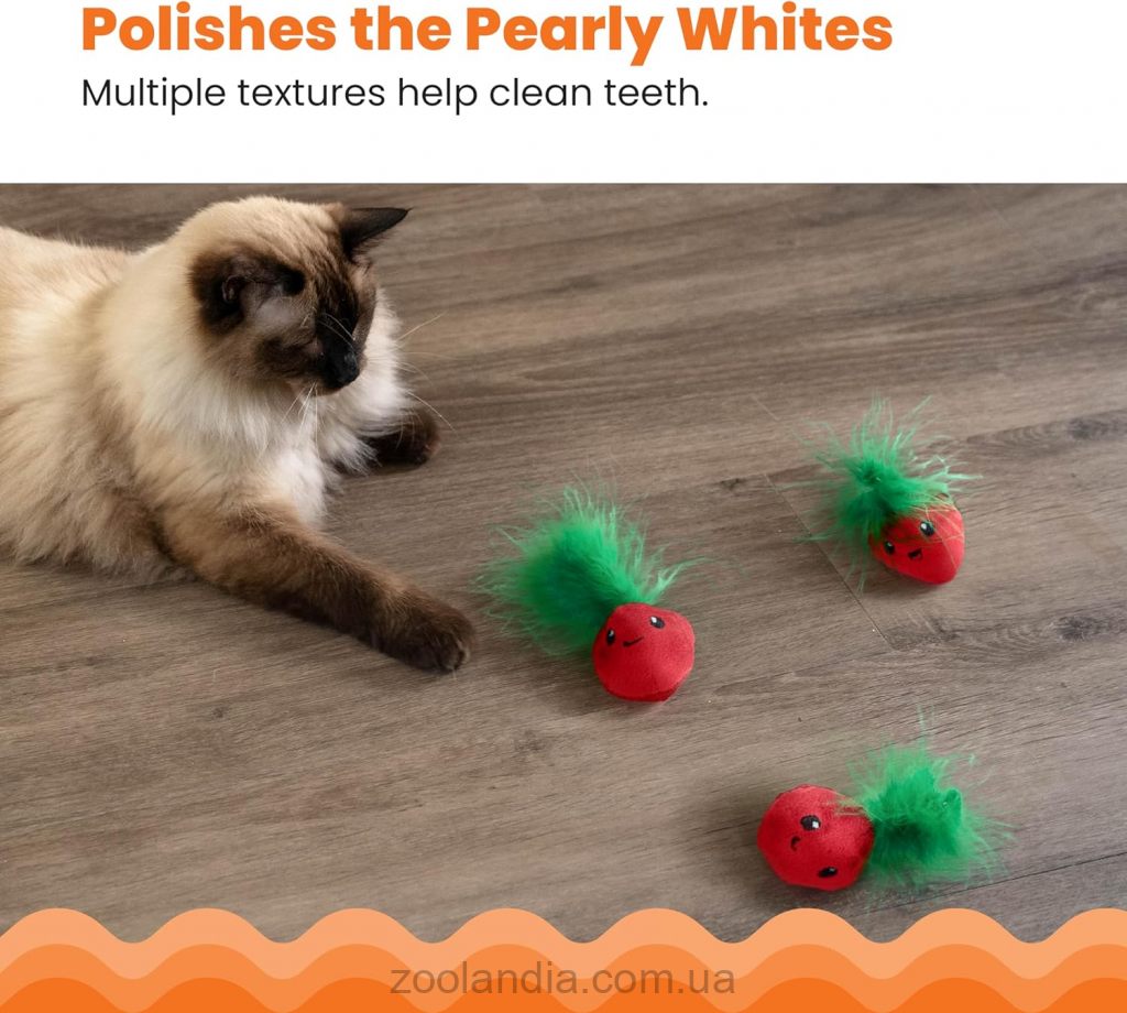 Мультитектурная поверхность способствует очищению зубов во время игры. Игрушки размером с клубнику идеально подходят для отбивки лапами, ношения в зубах и преследования.
