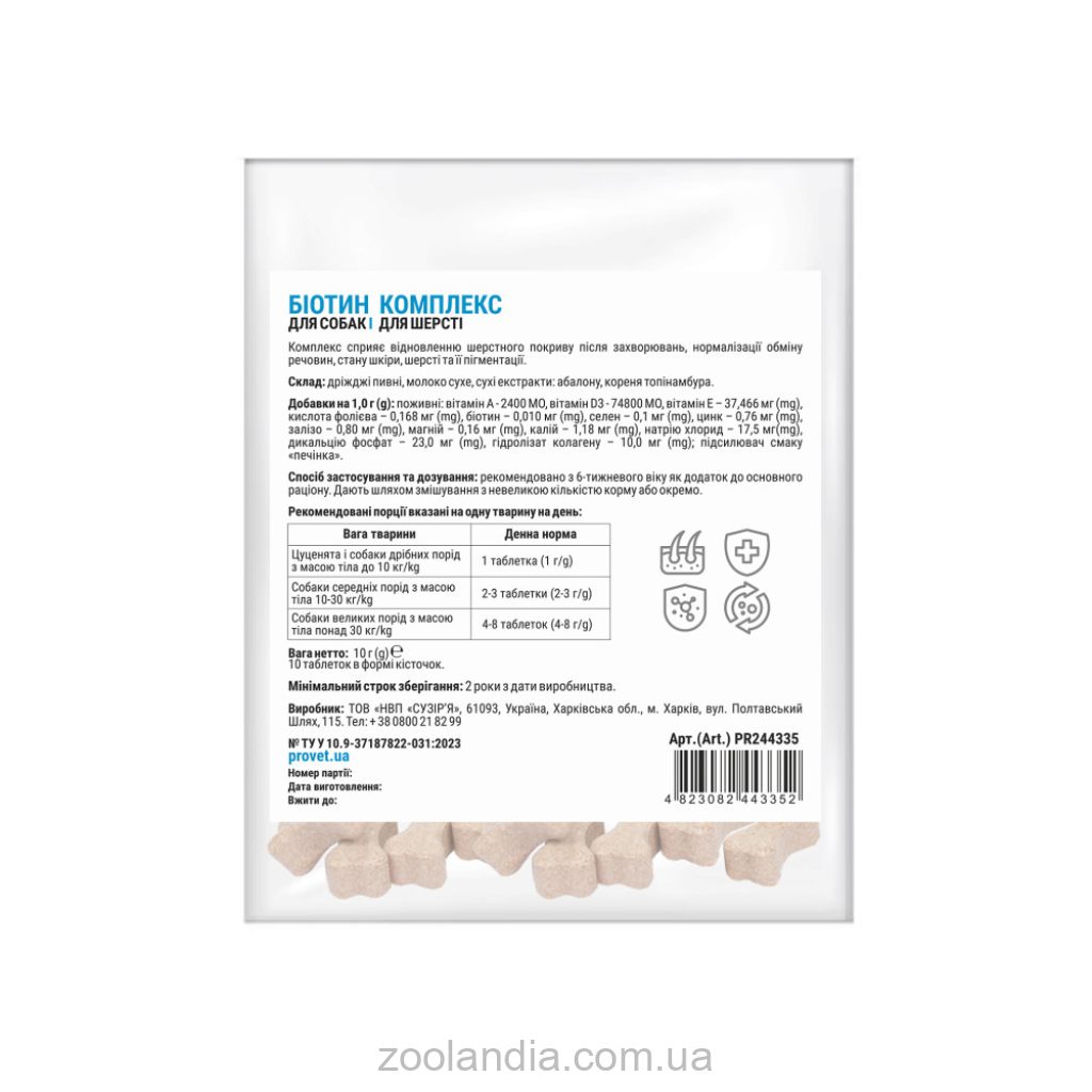 Состав: Дрожжи пивные, витаминно-минеральный Комплекс, дикальция фосфат, сухие экстракты: аболонна, корня топинамбура; пробиотические бактерии: Streptococcus faecium, Lactobacillus plantarum, Lactobacillus salivarius; Биотин, гидролизат коллагена, микрокристаллическая целлюлоза, крахмал картофельный, стеарат кальция, гипромелоза, ароматизатор пищевой «мясо».