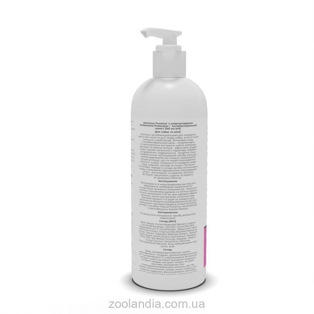 Применение: применять в неразведенном виде для сохранения необходимой терапевтической концентрации активных компонентов. Наносить шампунь массажными движениями на влажную шерсть, вспенить, выдержать 5-10 минут для лучшего эффекта, тщательно смыть достаточным количеством воды. Использовать 2-3 раза в неделю для достижения желаемого антибактериального действия. Для лучшего эффекта использовать в комплексном уходе с средством Маска Puramur успокаивающая и дезинфицирующая Express Beauty.