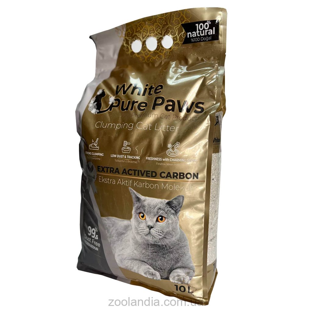 White Pure Paws - комкующийся бентонитовый наполнитель с активированным углем для кошачьих туалетов. Это мелкозернистый наполнитель, благодаря чему он чрезвычайно эффективен и прекрасно впитывает влагу, образуя компактные и прочные комки, которые очень легко убирать. Наполнитель White Pure Paws изготавливается из гранулированной бентонитовой глины - 100% натуральный продукт, который обладает высокой эффективностью при использовании его для наполнения кошачьих лотков.