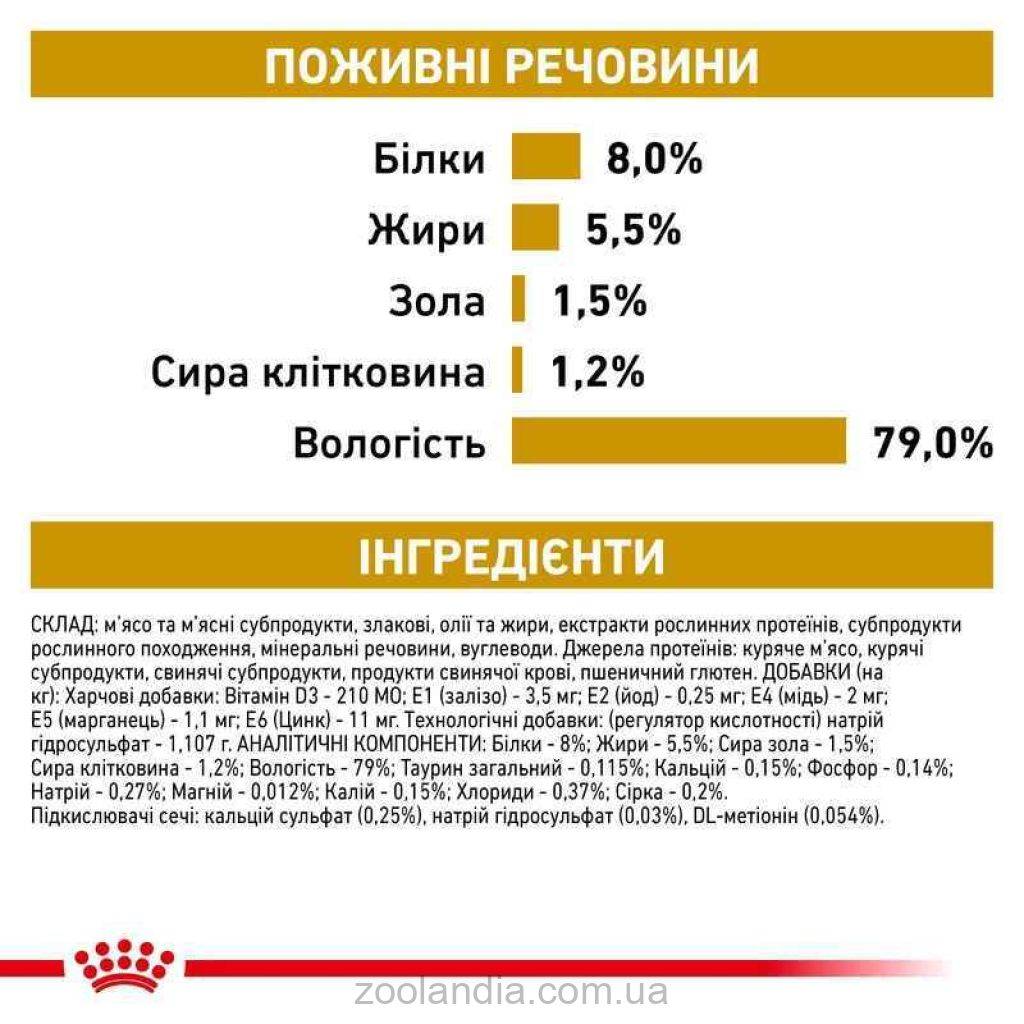 Аналитические компоненты: сырой протеин - 8,0 %; сырой жир - 5,5 %; сырая зола - 1,5 %; сырая клетчатка - 1,2 %; влажность – 79 %; таурин (общий) - 0,115 %; кальций - 0,15 %; фосфор - 0,14 %; натрий - 0,27 %; магний - 0,012 %; калий - 0,15 %; хлориды - 0,37 %; сера -0,2 %.