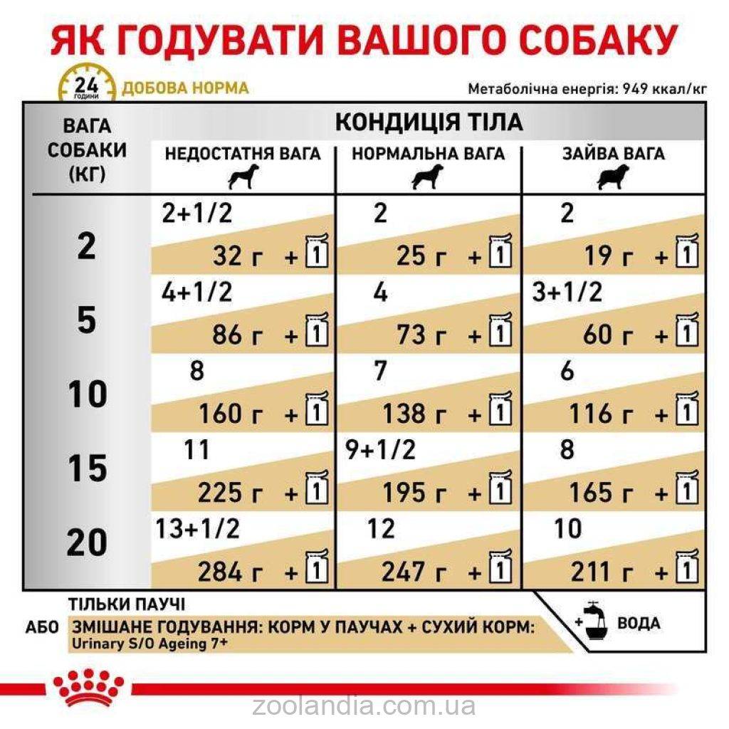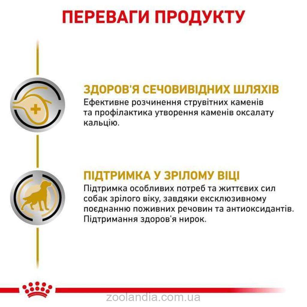 Собаки, которые страдают от мочекаменной болезни и в то же время нуждаются в специальной поддержке из-за своего преклонного возраста, получают влажную пищу, которая оптимально адаптирована к их потребностям с помощью одного из лечебных кормов Royal Canin. Состав корма специально разработан для ускорения разложения мочевых камней и противодействия образованию новых кристаллов и камней. Он имеет низкое содержание магния, умеренное содержание высококачественных белков и, таким образом, может оказывать подкисляющее и разжижающее действие на мочу. Это может помочь создать менее благоприятную мочевую среду для образования кристаллов и снизить риск повторных мочевых камней.