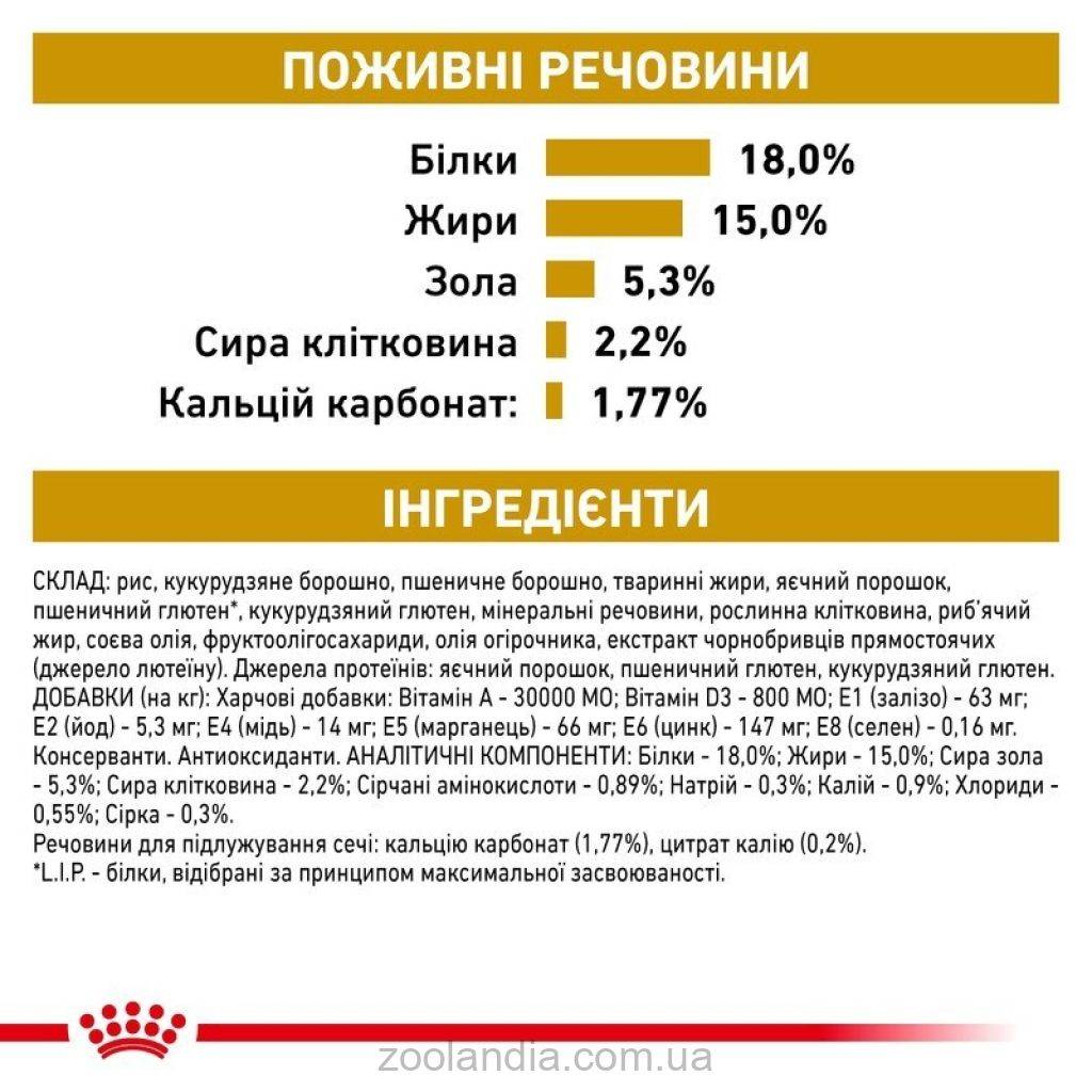 Состав: Рис, кукурузная мука, пшеничная мука, животные жиры, яичный порошок, пшеничный глютен*, кукурузный глютен, минеральные вещества, растительная клетчатка, рыбий жир, соевое масло, фруктоолигосахариды, масло огуречника, экстракт бархатцев прямостоячих (источник лютеина). Источники протеинов: яичный порошок, пшеничный глютен, кукурузный глютен.