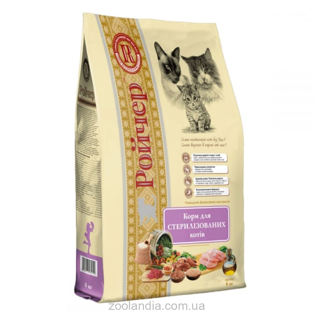 Roycher формула разработана с учетом сниженной потребности стерилизованных животных в энергии. Содержание в рационе кальция, магния и фосфора в четко выверенных пропорциях значительно снижают риск возникновения мочекаменной болезни. .
