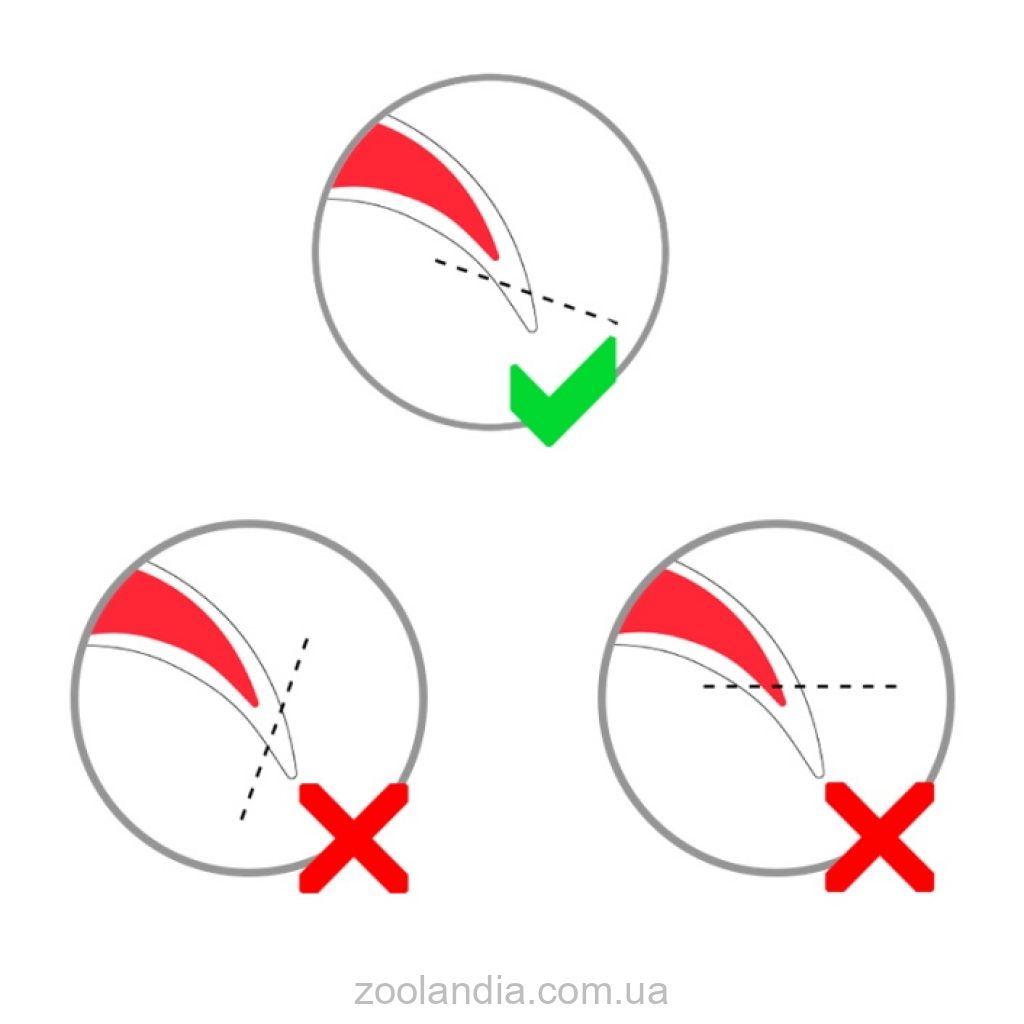 3. Срезайте когти под углом 45°, а не прямо поперек, при этом обрезанный край должен быть параллелен полу.