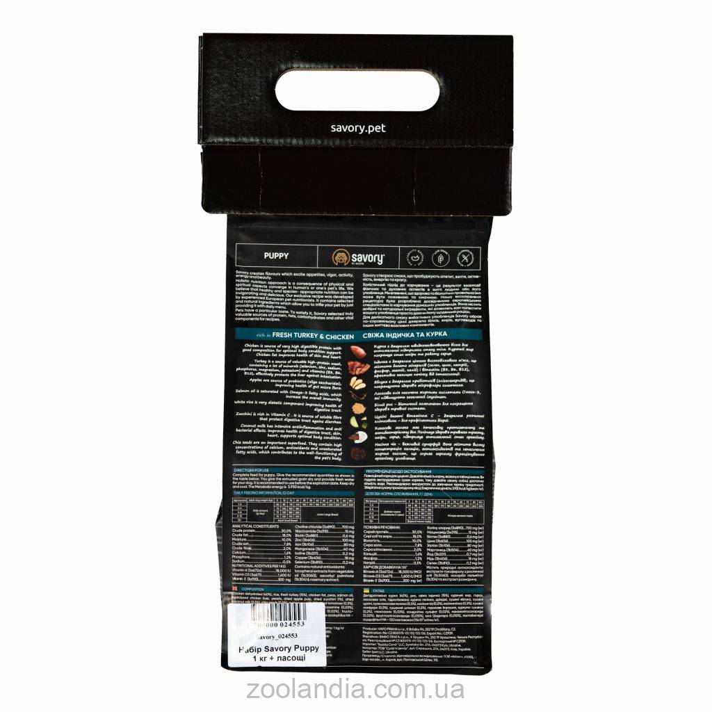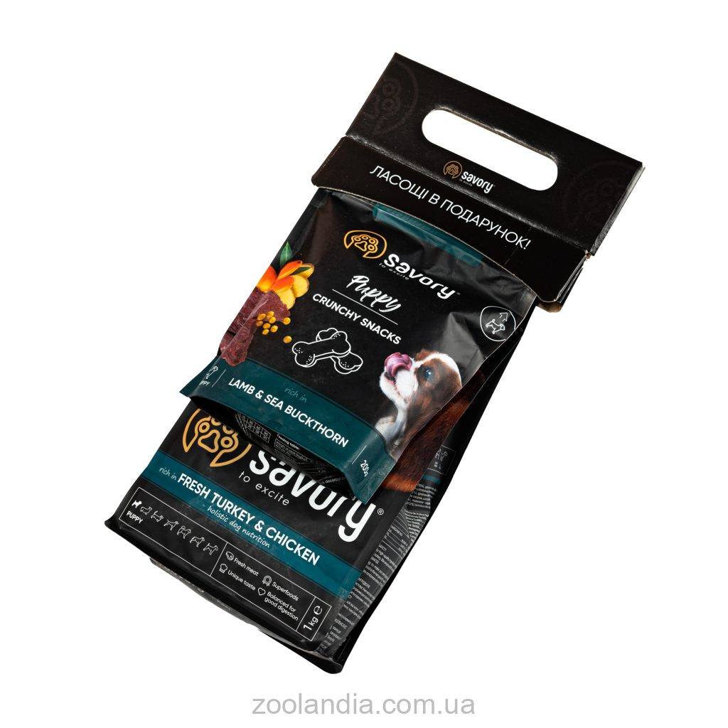 Savory Puppy rich in Fresh Turkey & Chicken – корм класса холистик для щенков всех пород.Эксклюзивная рецептура корма была разработана опытными европейскими специалистами по питанию домашних любимцев. Используя холистический подход, удалось создать биологически соответствующий, здоровый рацион для собак, который является полезным и вкусным настолько, что лапки оближешь. Сочетание отборных натуральных ингредиентов дает возможность заботиться о здоровье четвероногого, а изысканный вкус - дарить ему наслаждение от ежедневного потребления корма Savory.Сухой корм для щенков Savory содержит 55% качественного мяса индейки и курицы, суперфуды, яблоки, цуккини, шпинат. Эти компоненты созданы природой для здорового роста и гармоничного развития малыша.