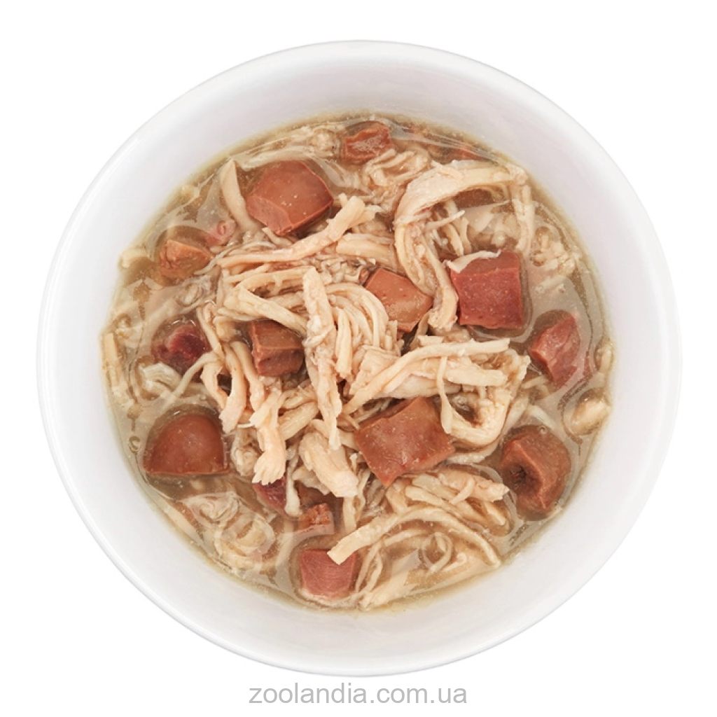 Основа блюда – нежное куриное филе, оно занимает центральное место в этом кулинарном творении. Подается с нарезанными на небольшие кусочки куриными желудками, печенью, сердцами и соусом в виде куриного бульона, который подчеркивает натуральный вкус ингредиентов и играет важную роль в поддержании гидратации вашего питомца.