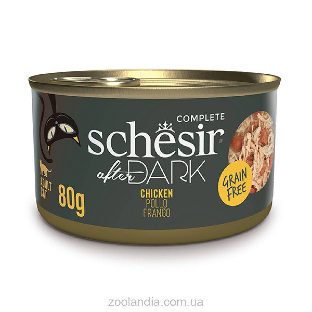 Консервы для котов Schesir After Dark Курица – полноценный сбалансированный рацион, который состоит из 100% натуральных ингредиентов, обогащенных витаминами, минералами и таурином. Это идеальный корм для вашего домашнего хищника: в нем много легкоусвояемого качественного белка и нет злаков.
